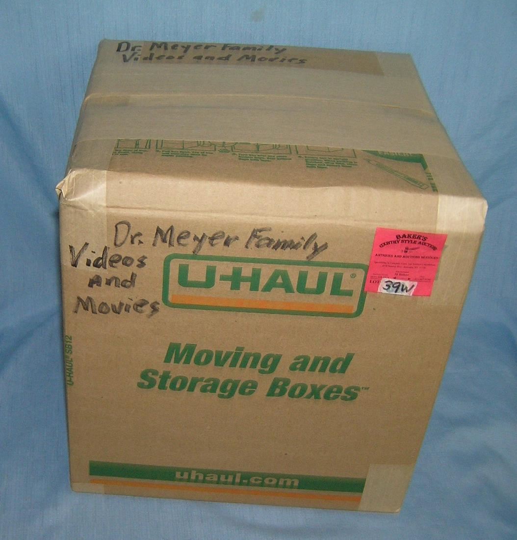 Moving and Storage Company mystery box lot marked Dr. Meyer family videos and movies part of a moving and storage company seized or unclaimed merchandise group sent to auction for liquidation est. value $50.00-60.00