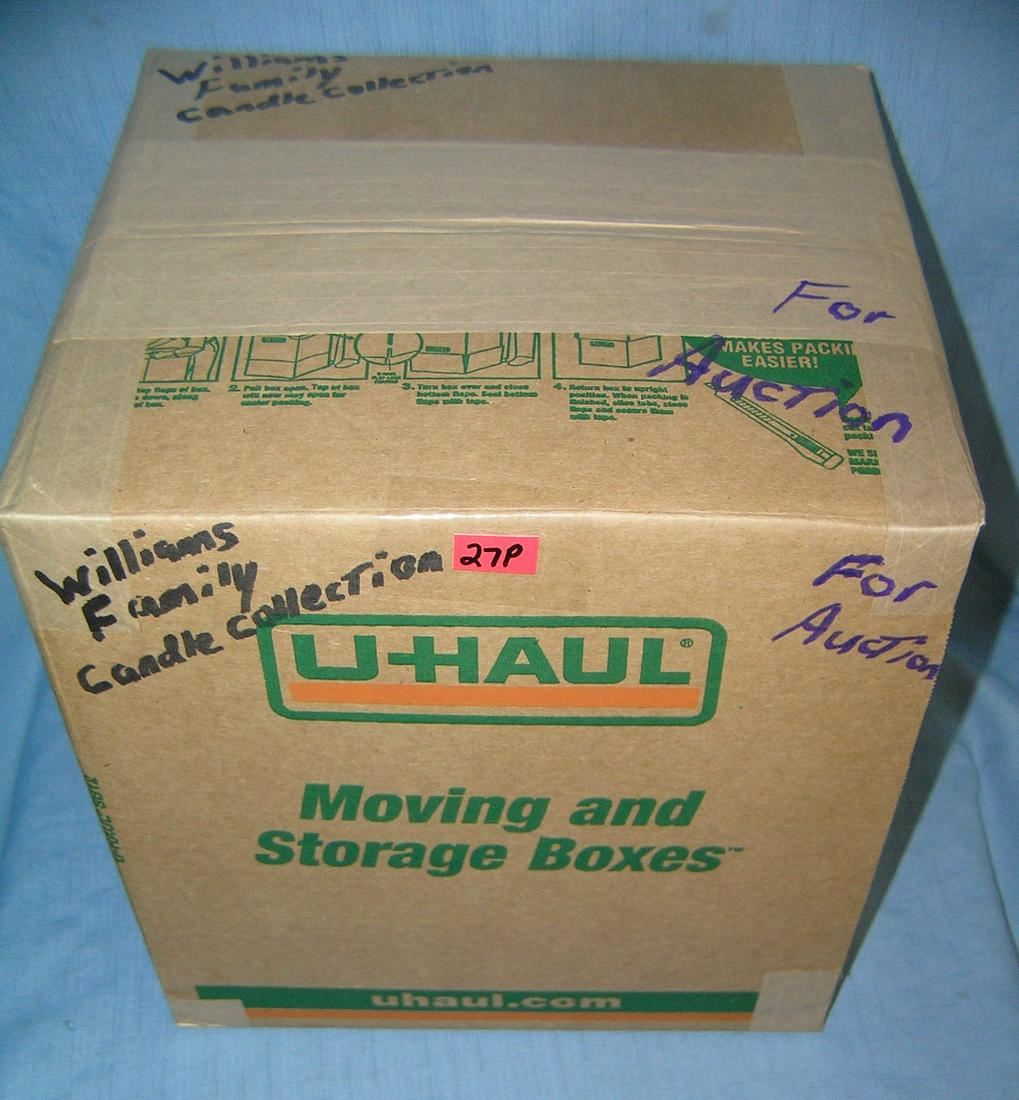 Moving and Storage Company mystery box lot marked William's family candle collection part of a moving and storage company seized or unclaimed merchandise group sent to auction for liquidation est. value $40.00-50.00