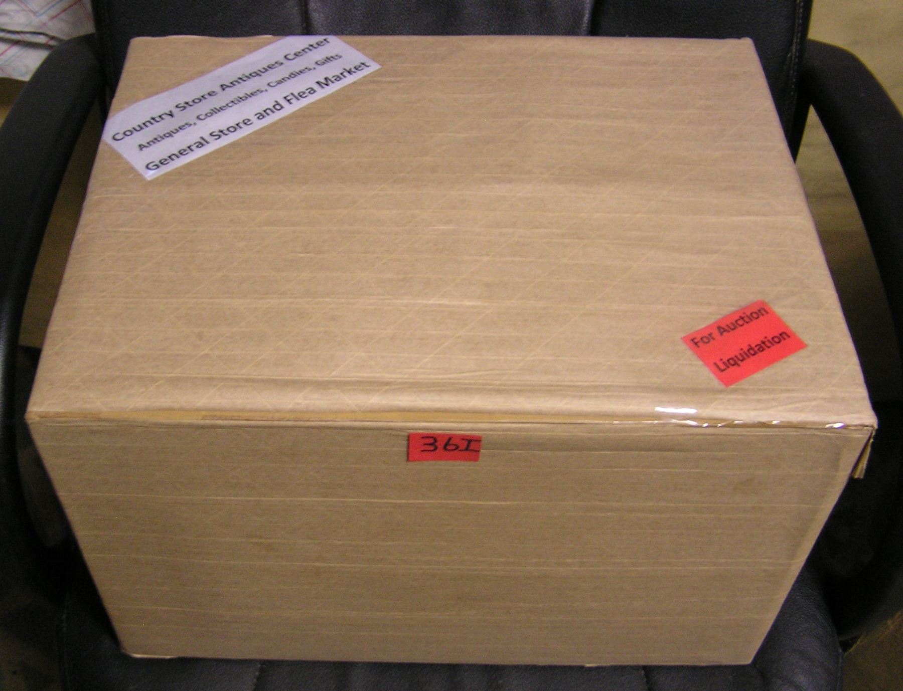Moving and Storage Company mystery box lot marked The Country Store Antiques Center: Antiques, Collectibles, Candies, Gifts, General Store and Flea Market part of a moving and storage company seized or unclaimed merchandise group sent to auction for liquidation est. value 100.00-125.00