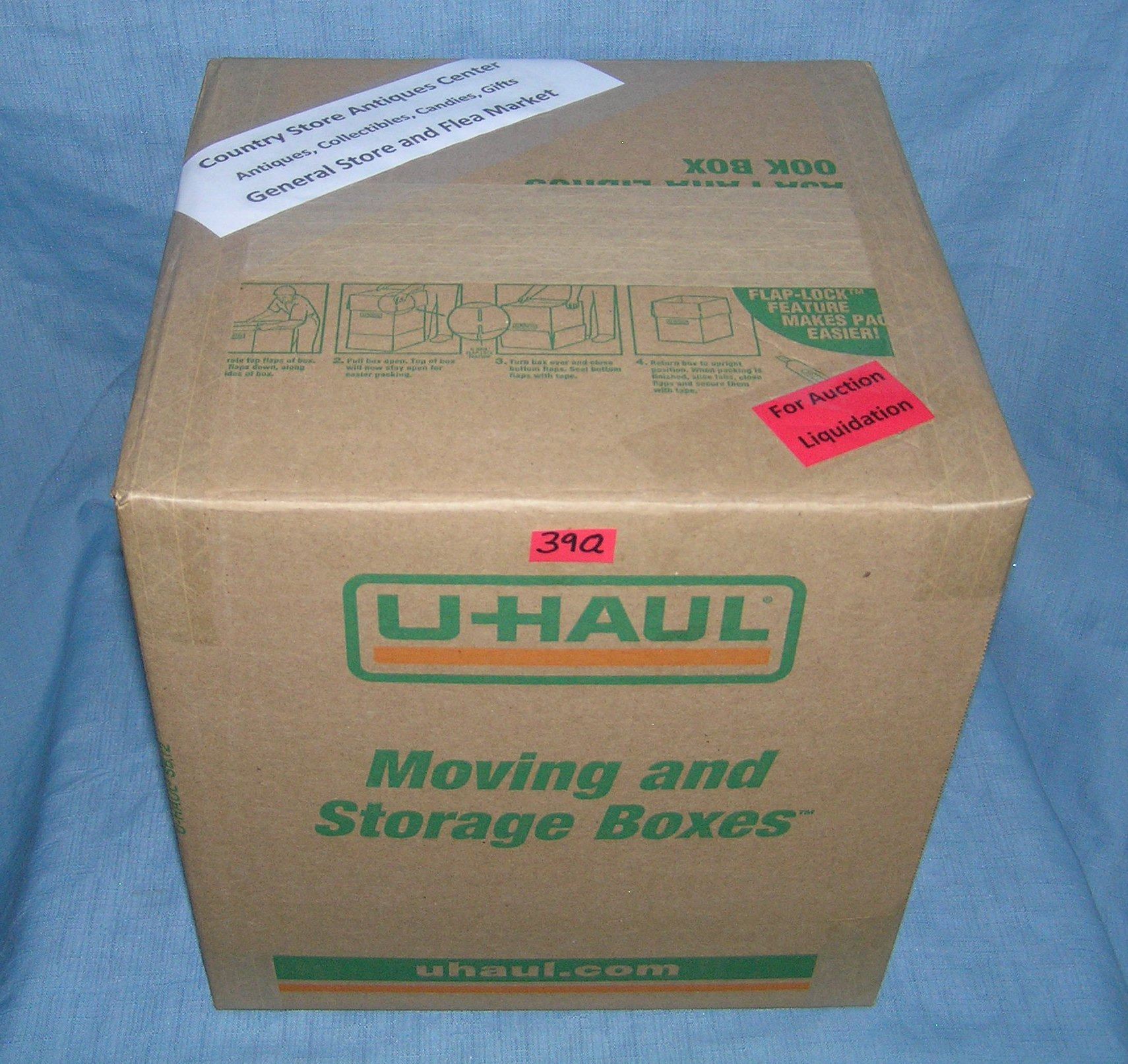 Moving and Storage Company mystery box lot marked The Country Store Antiques Center: Antiques, Collectibles, Candies, Gifts, General Store and Flea Market part of a moving and storage company seized or unclaimed merchandise group sent to auction for liquidation est. value 100.00-125.00