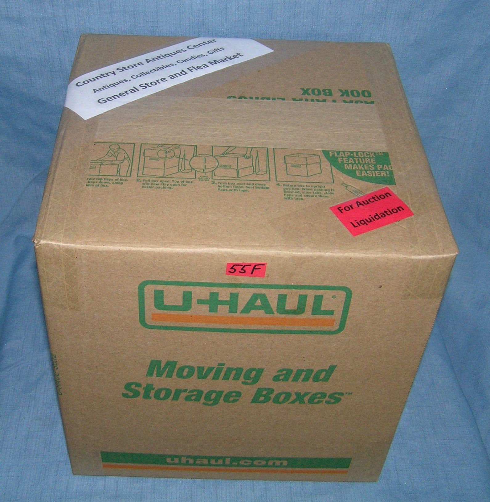 Moving and Storage Company mystery box lot marked The Country Store Antiques Center: Antiques, Collectibles, Candies, Gifts, General Store and Flea Market part of a moving and storage company seized or unclaimed merchandise group sent to auction for liquidation est. value 100.00-125.00