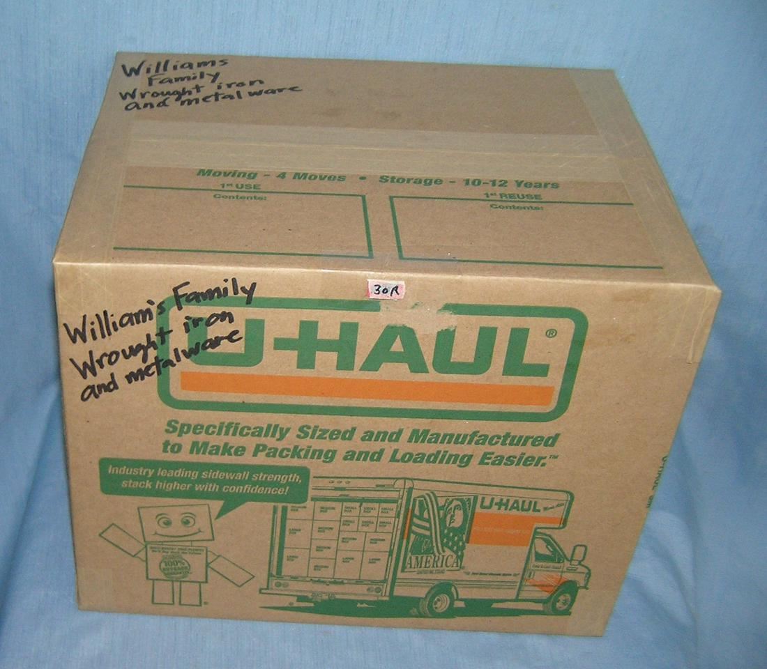 Moving and Storage Company mystery box lot marked William's family wrought iron and metalware part of a moving and storage company seized or unclaimed merchandise group sent to auction for liquidation  est. value $40.00-50.00