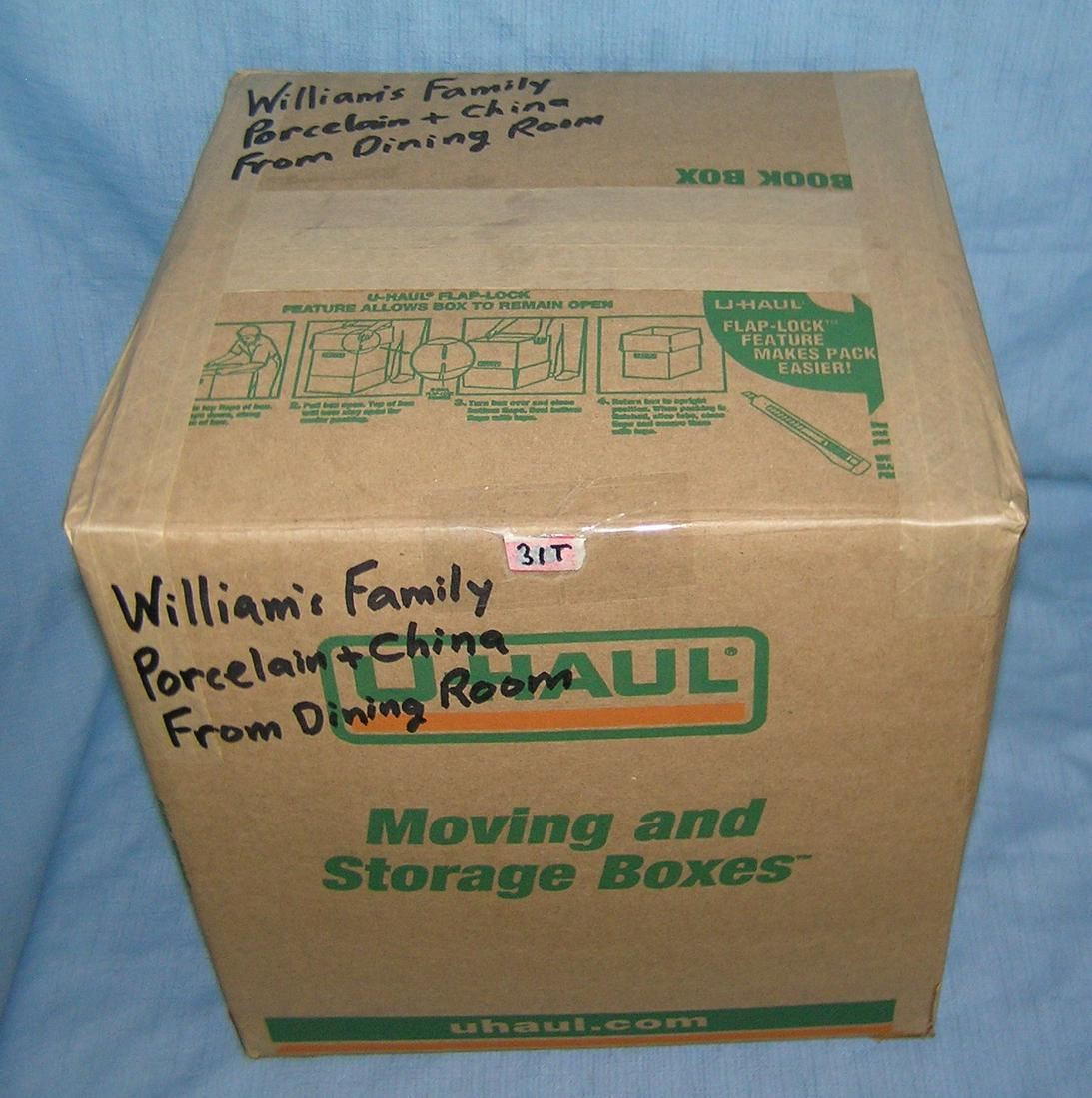 Moving and Storage Company mystery box lot marked William's family porcelain and china dining room area part of a moving and storage company seized or unclaimed merchandise group sent to auction for liquidation  est. value $40.00-50.00