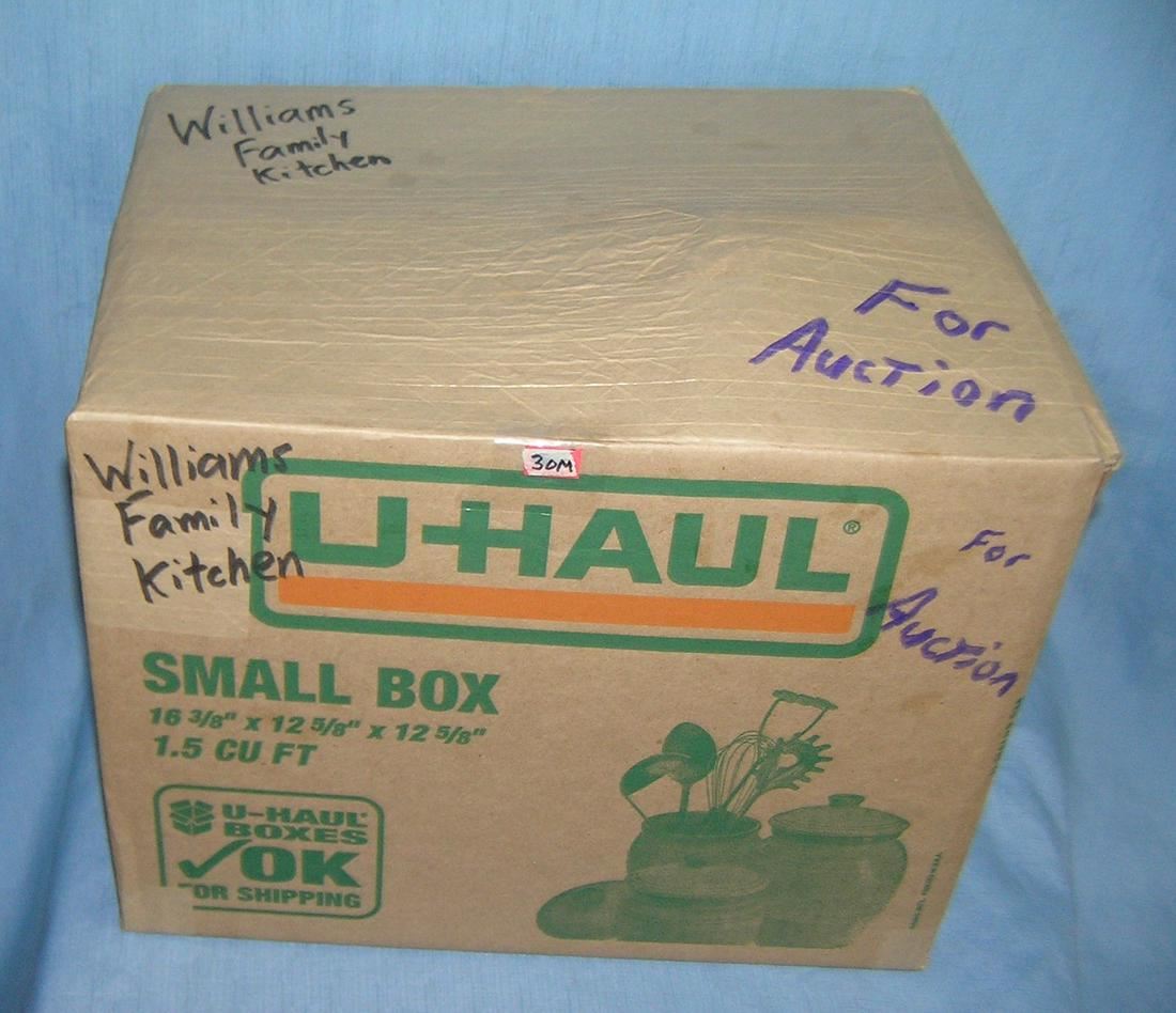 Moving and Storage Company mystery box lot marked William's Family kitchen part of a moving and storage company seized or unclaimed merchandise group sent to auction for liquidation est. value $40.00-50.00