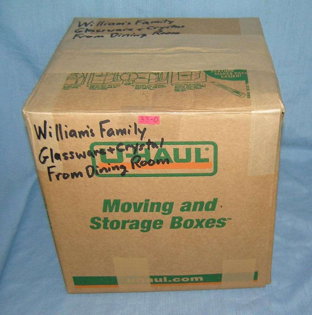Moving and Storage Company mystery box lot marked William's family glassware and crystal dining room area part of a moving and storage company seized or unclaimed merchandise group sent to auction for liquidation est. value $40.00-50.00