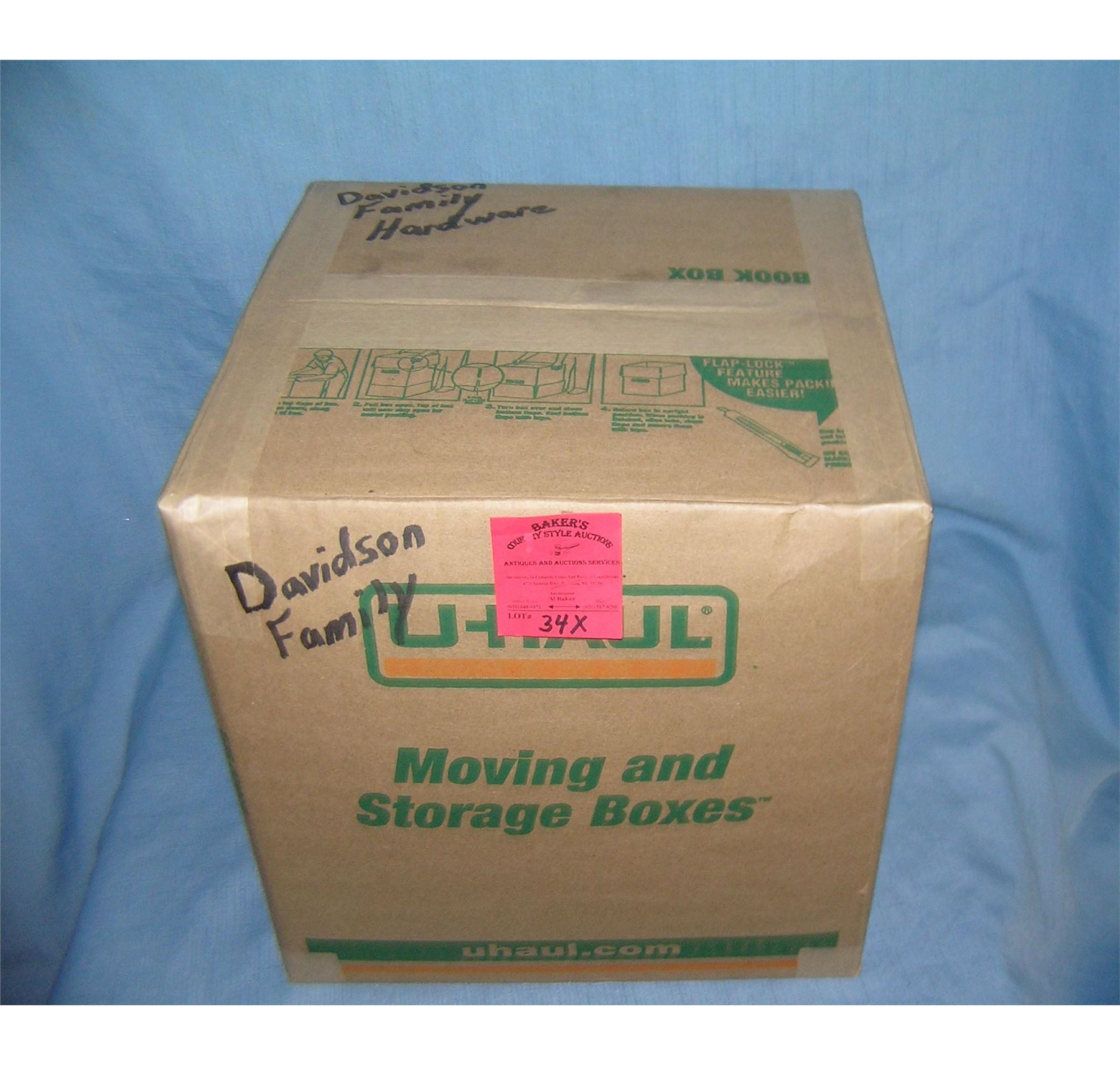 Moving and Storage Company mystery box lot marked Davidson Family hardware part of a moving and storage company seized or unclaimed merchandise group sent to auction for liquidation est. value $50.00-60.00