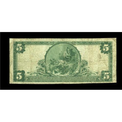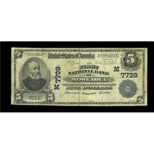 <B>Moweaqua, IL</B></I> - $5 1902 Plain Back Fr. 598 <B>The First NB</B></I> Ch. # (M)7739<BR>This is a scarce bank that was the only issuer in town and it issued large notes only. Eleven pieces are listed in the census, a figure which is quite deceptive, as one collector owns over one-fourth of the known notes. We have recorded a total of only six public offerings from here in almost seventy years. This figure is far more indicative of the real availability of notes from this Shelby County bank. <B>Very Good,</B></I> with traces of purple stamped signatures.<BR><I>From The Lincoln Collection</B></I><BR><BR><b>Shipping:</b> Coins & Currency (<a target="_blank" href="http://www.heritageauctions.com/common/shipping.php">view shipping information</a>)