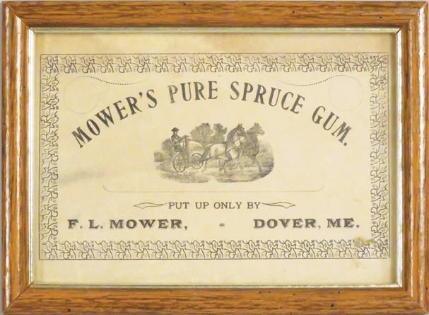 Mower's Pure Spruce Gum Advertisement. F. L Mower, Dover, ME. Slight age darkening otherwise very good condition. 6 1/2 X 4 1/2 inches.