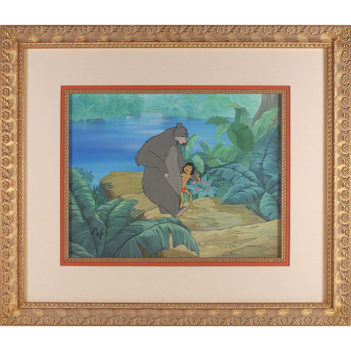 (Walt Disney Studios, 1967) Original production cel and production background featuring Mowgli and Baloo from The Jungle Book, showing the easygoing bear with his arm around his young friend. The cel is placed on a skillfully hand-painted production background of a jungle lake scene, from the end of the film where a girl is carrying water from the river. Image of Mowgli and Baloo measures 4.5 x 6.5, with a mat opening of 14.25 x 11. This piece is also framed to an overall size of 23.5 x 20.5. Walt Disney Productions seal to lower left. In fine condition. An excellent, beautifully presented cel pairing these two important characters against a highly desirable production background.