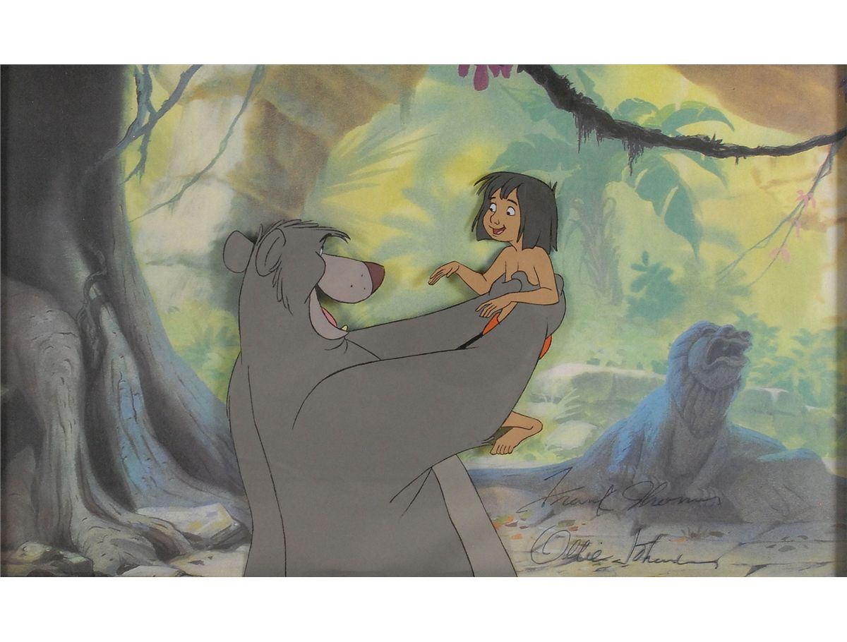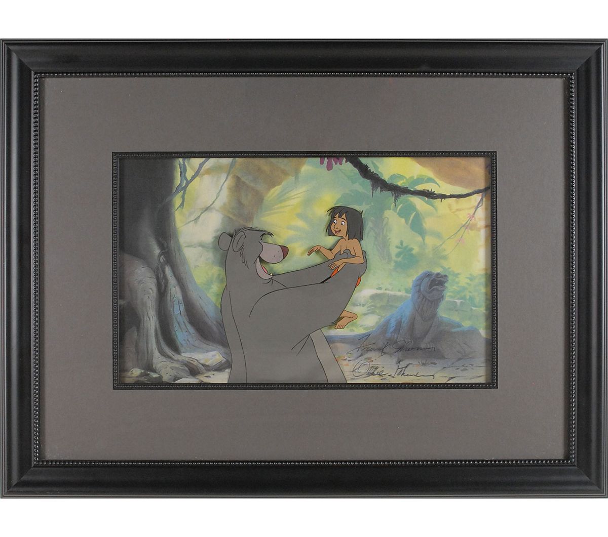 (Walt Disney Studios, 1967) Original production cel featuring Mowgli and Baloo from Jungle Book, showing the bear happily lifting the young boy into the air. Signed in the lower right in black felt tip by Frank Thomas and Ollie Johnston. The cel is placed on a laser copy background. Image measures 5.75 x 7, with a mat opening of 14.25 x 8.75. This piece is also framed to an overall size of 23.75 x 18. In fine condition.