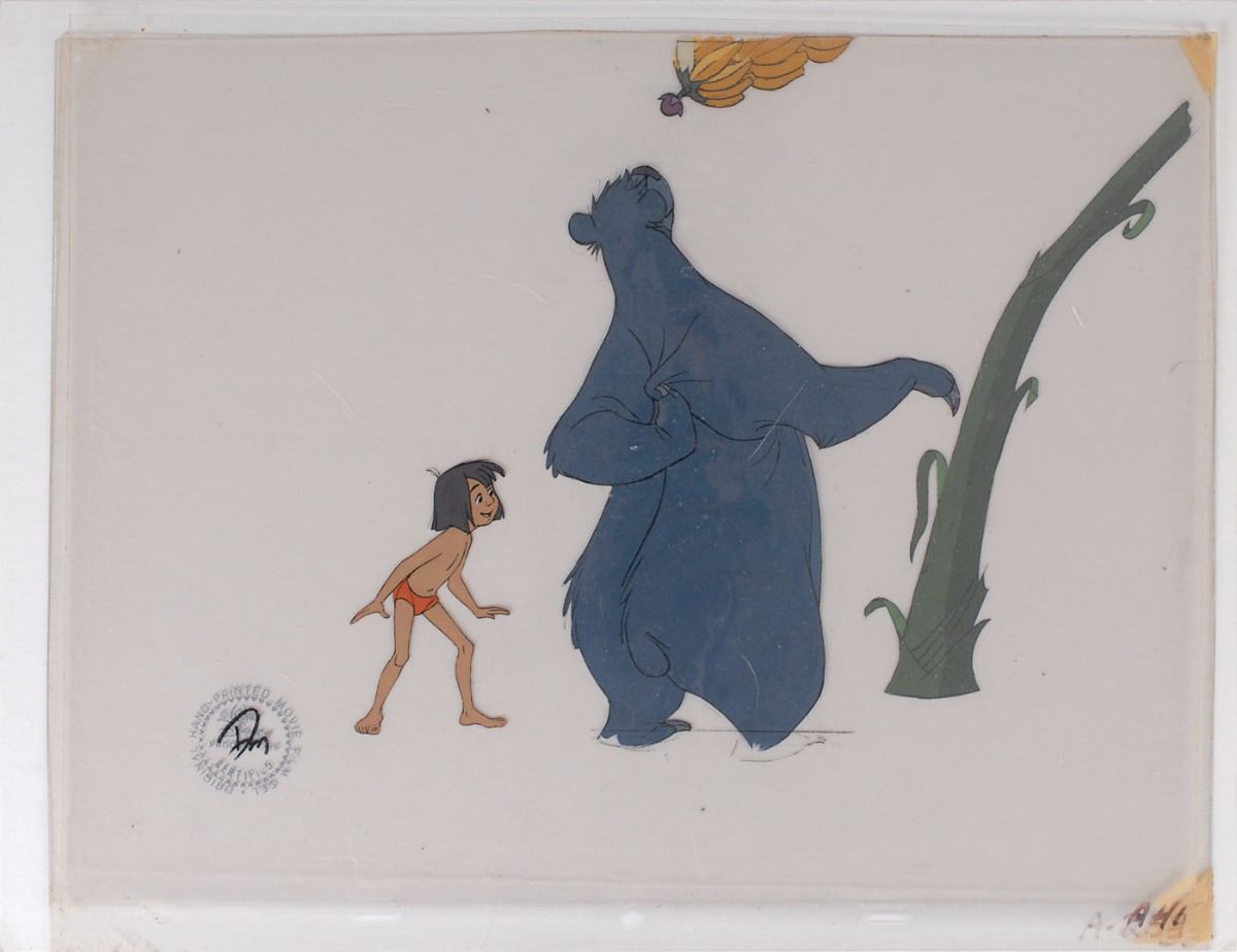 (Walt Disney Studios, 1967) Original production cels featuring Baloo and Mowgli from The Jungle Book, showing the pair interested in a banana tree. Image measures 2.25 x 3.5 and 8.75 x 9.75. The piece has the silver Walt Disney Company seal to lower left, initialed in black paint, “Dm,” with a Walt Disney Productions certificate on the reverse. In fine condition, with slight adhesive remnants to edges and some trivial surface marks.