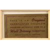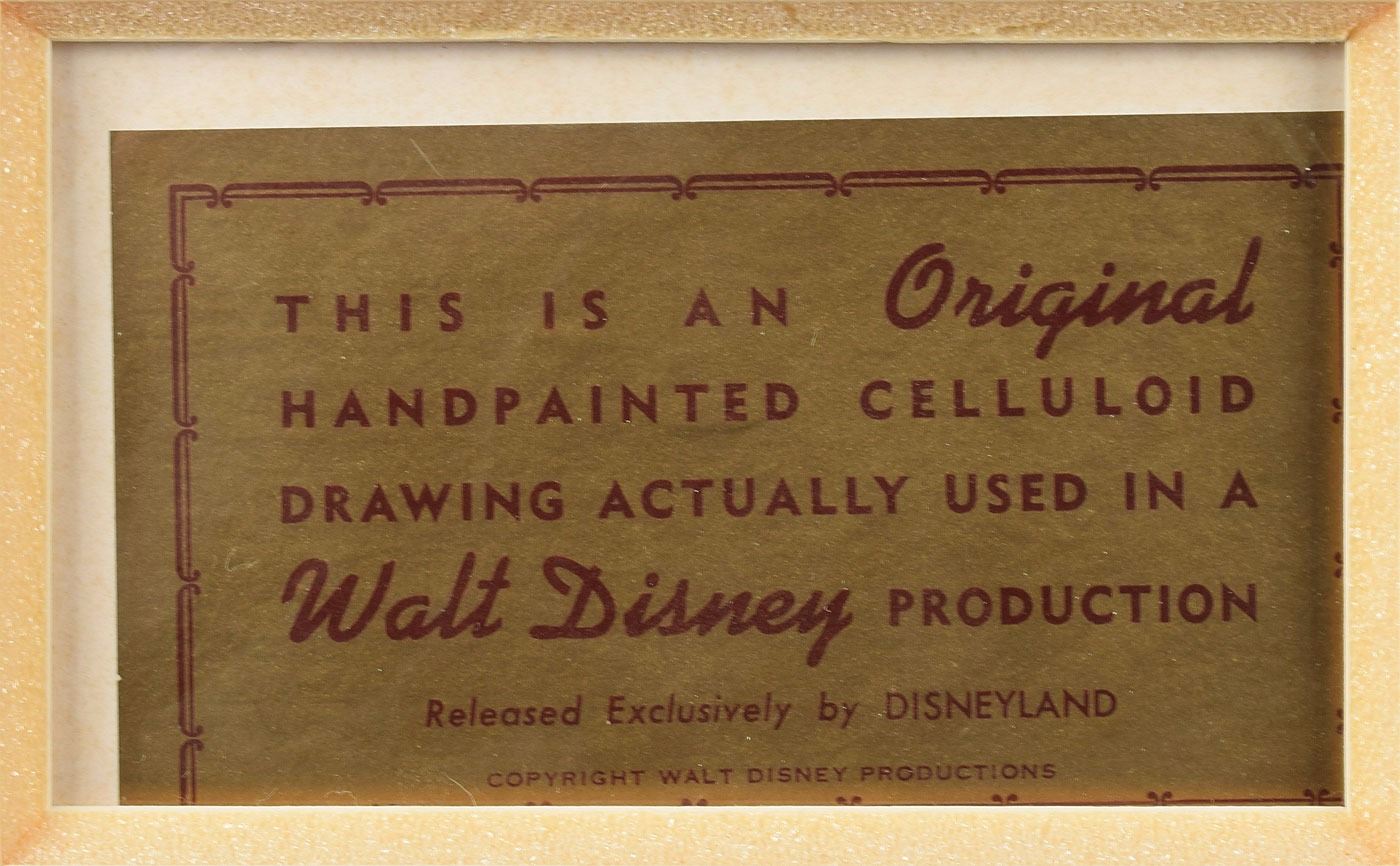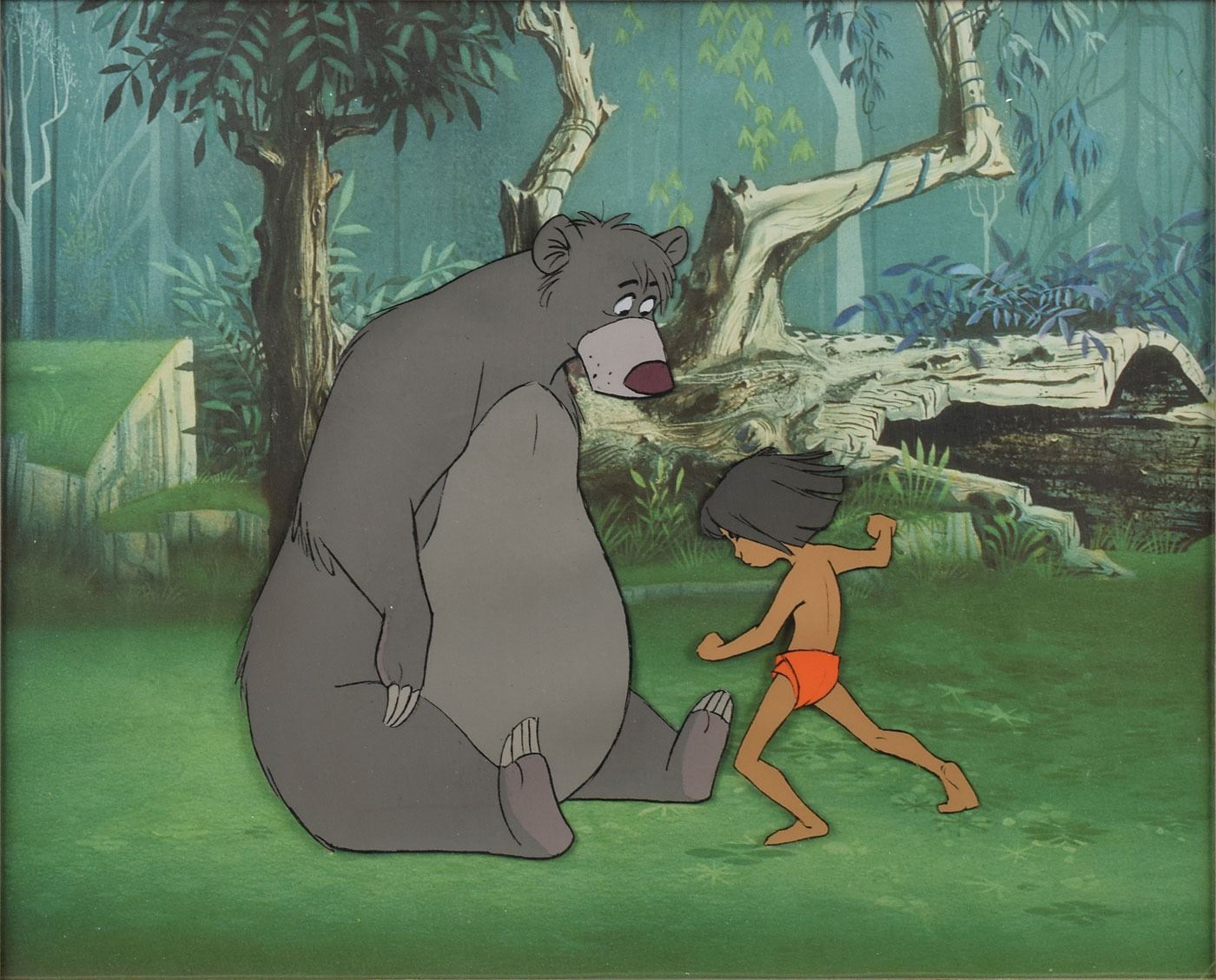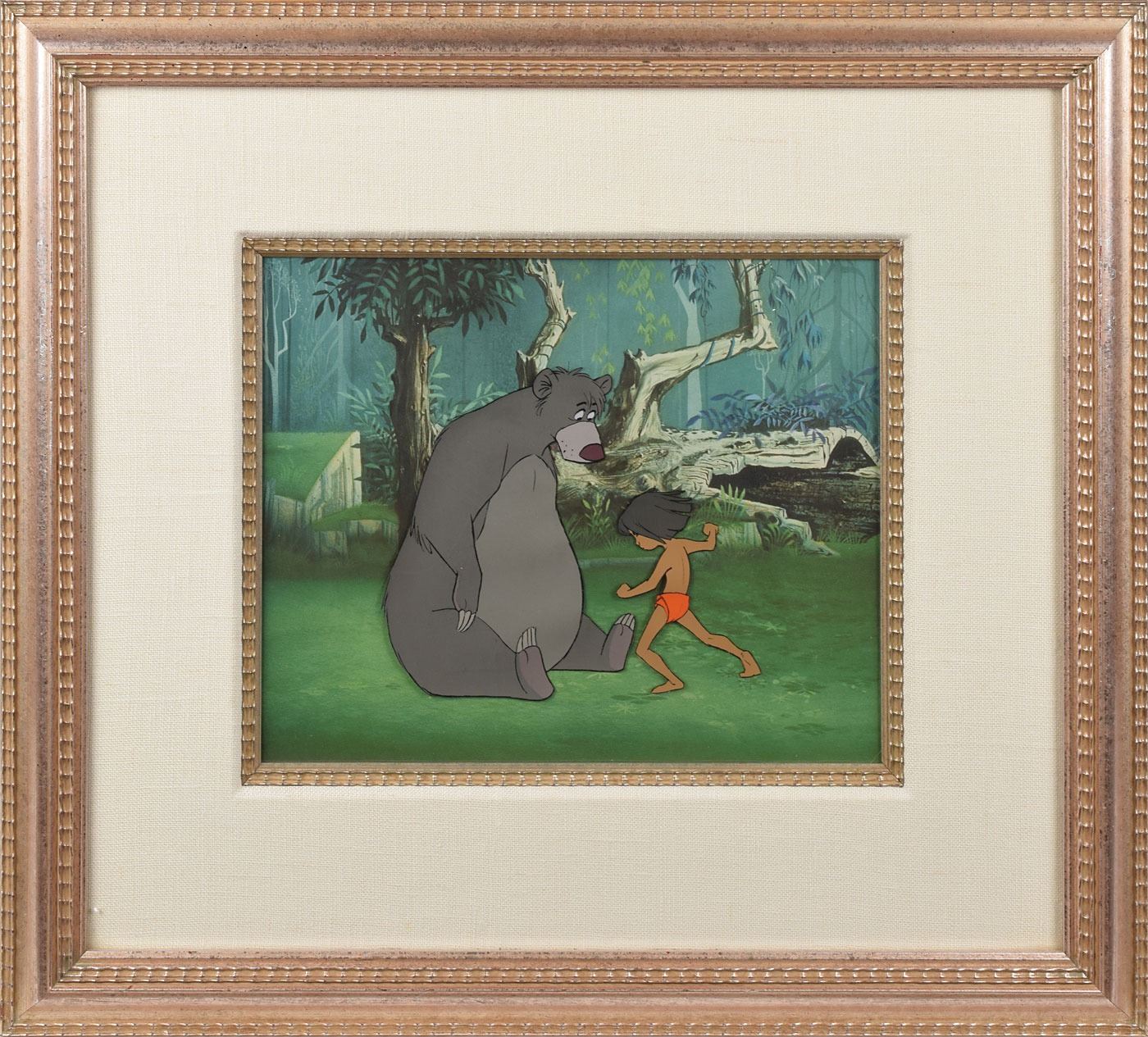 (Walt Disney Studios, 1967) Original production cel featuring Mowgli and Baloo from The Jungle Book. The cel is placed on a Disney lithograph background. Total image measures 6.75 x 6, with a mat opening of 11 x 9. Framed to an overall size of 20 x 18. Originally sold at Disneyland and reverse bears a gold label stating that it is an original hand-painted celluloid actually used in a Walt Disney production. In fine condition.