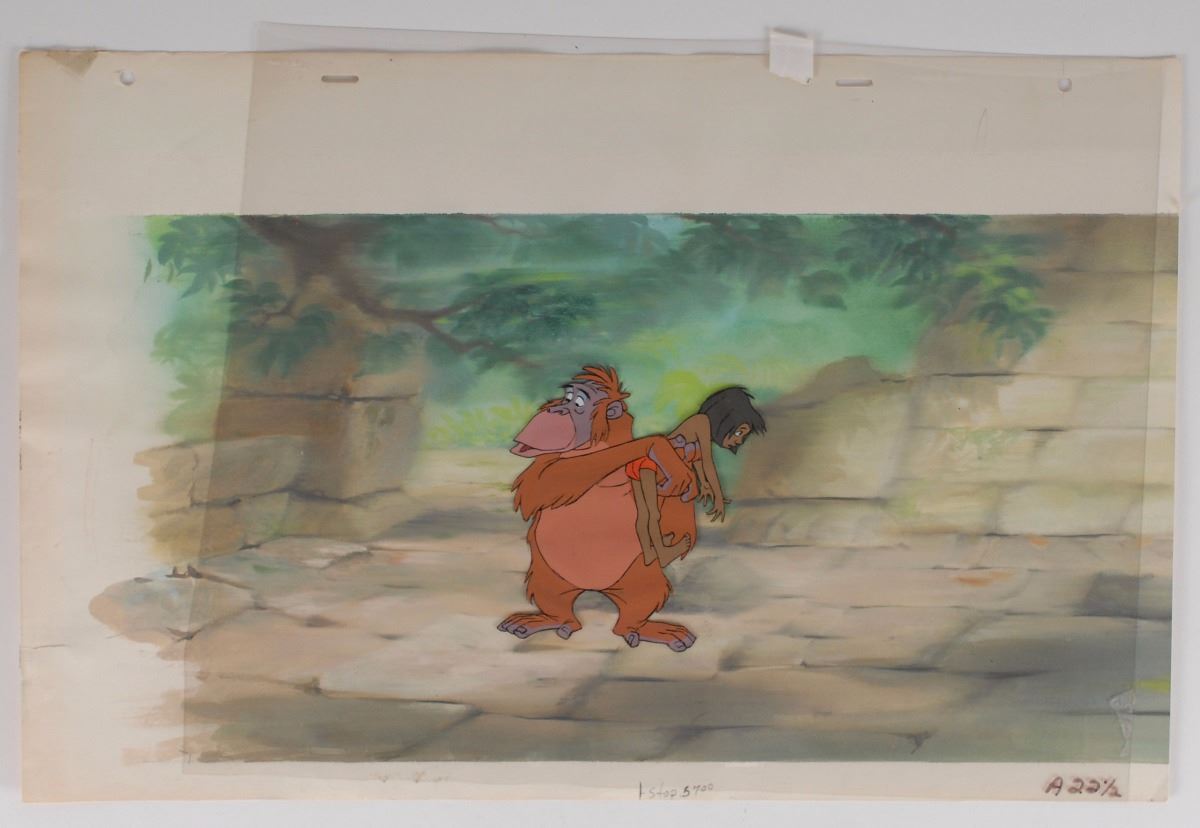 (Walt Disney Studios, 1967) Original production cel and production background featuring Mowgli and King Louie from The Jungle Book, depicting a fantastic moment from the temple scene during the musical number, ‘I Wan’na Be Like You (The Monkey Song).’ The cel is slightly trimmed to 15 x 12.5 and placed on a hand-painted watercolor background. Image measures 4.25 x 4.75, with overall dimensions of 19.25 x 12.75. In fine condition, with a small tape-repaired tear to left edge of background, and trivial soiling and adhesive remnants to cel.