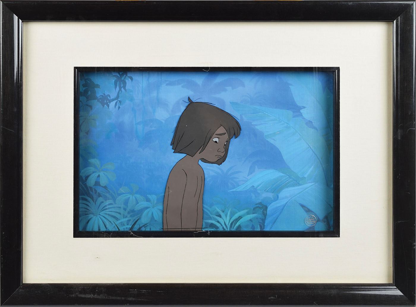 (Walt Disney Studios, 1967) Original production cel featuring Mowgli from The Jungle Book, showing the wolf-raised child in a somber half-length pose. The cel is placed on a matching studio copy background. Image measures 4.25 x 7.75, with a mat opening of 14.75 x 9.25. Matted and framed to an overall size of 23.5 x 17.5. The piece has the silver Walt Disney Company seal to lower right. In fine condition, with tape-repaired slits to frame backing from previous restoration. Accompanied by a certificate of authenticity from the Walt Disney Company.