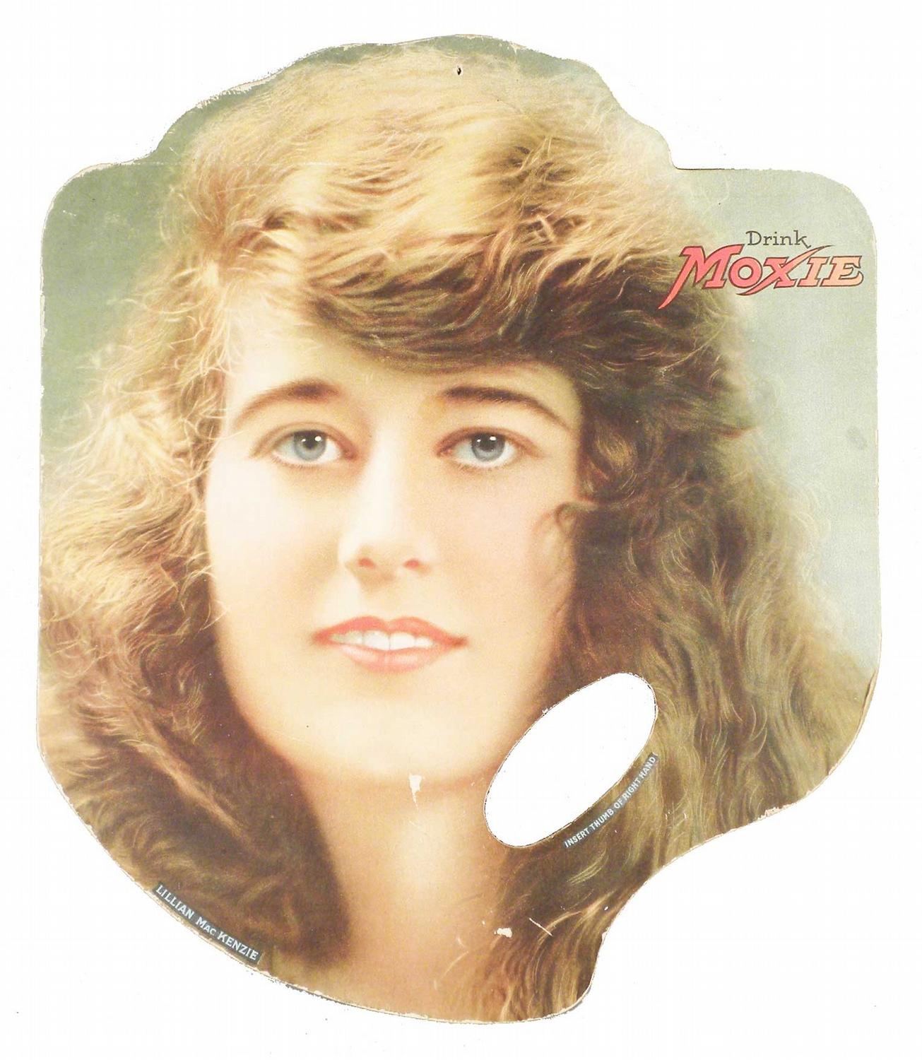 Moxie Die Cut Cardboard Fan. Depicting Lillian Mac Kenzie. Entitled, "Drink Moxie". Some minor paper loss at chin and right side of neck otherwise very good condition. 8 1/2 X 10 inches.