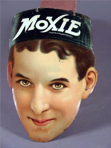Moxie Die Cut Embossed Tin Sign, chain hanger. Very rare. Minor scratches otherwise excellent condition. 4 1/2 X 7 inches.