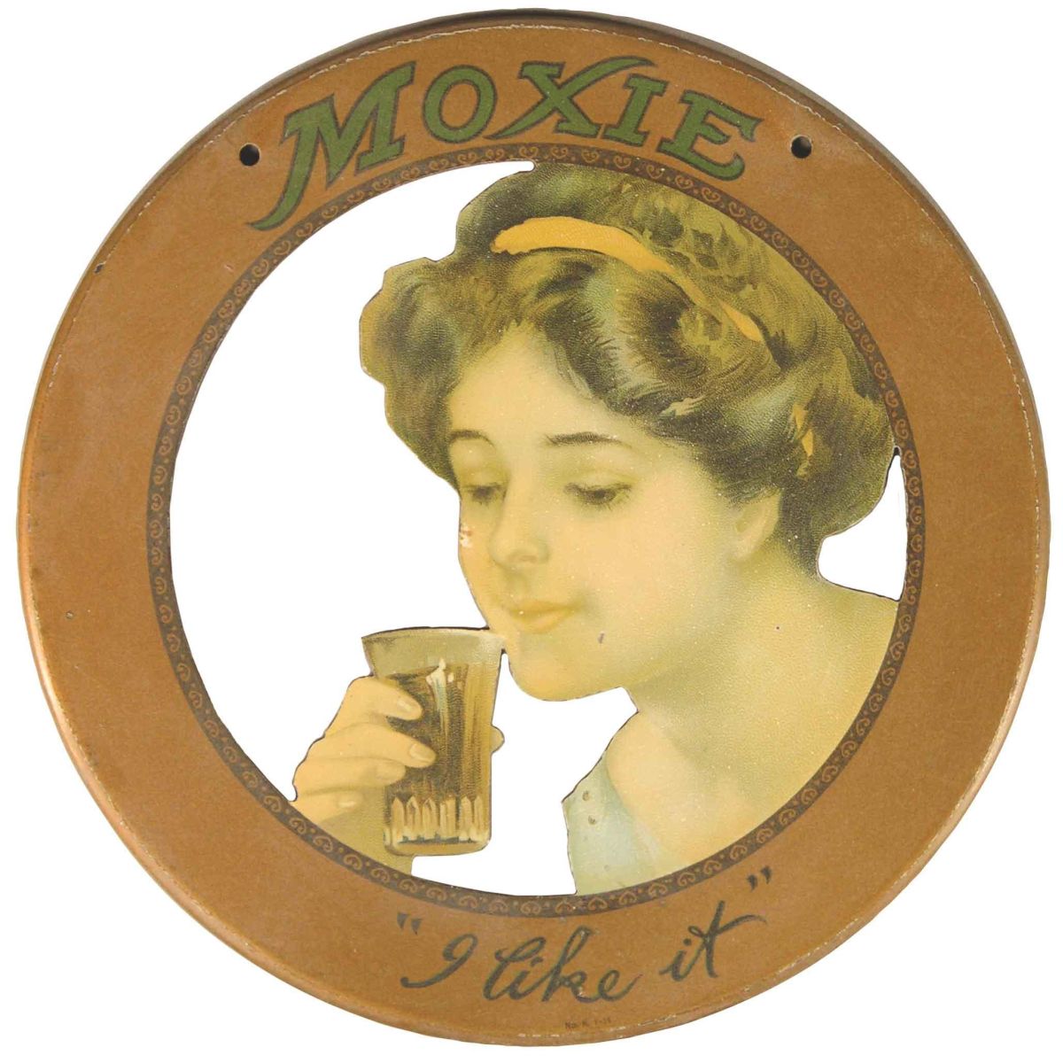 Moxie Die Cut Tin Sign. Some fading otherwise very good condition. 6 1/8 inch diameter. Start Price $40
