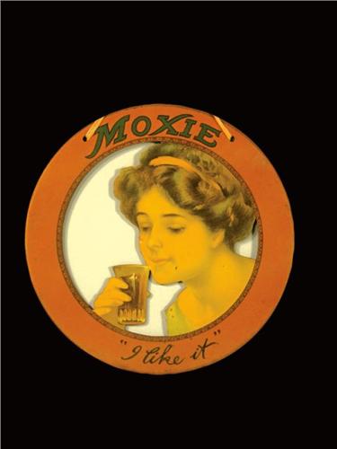 Very Rare Moxie Die Cut Tin String Hanger. Very good condition. 6 1/8 inch dia.