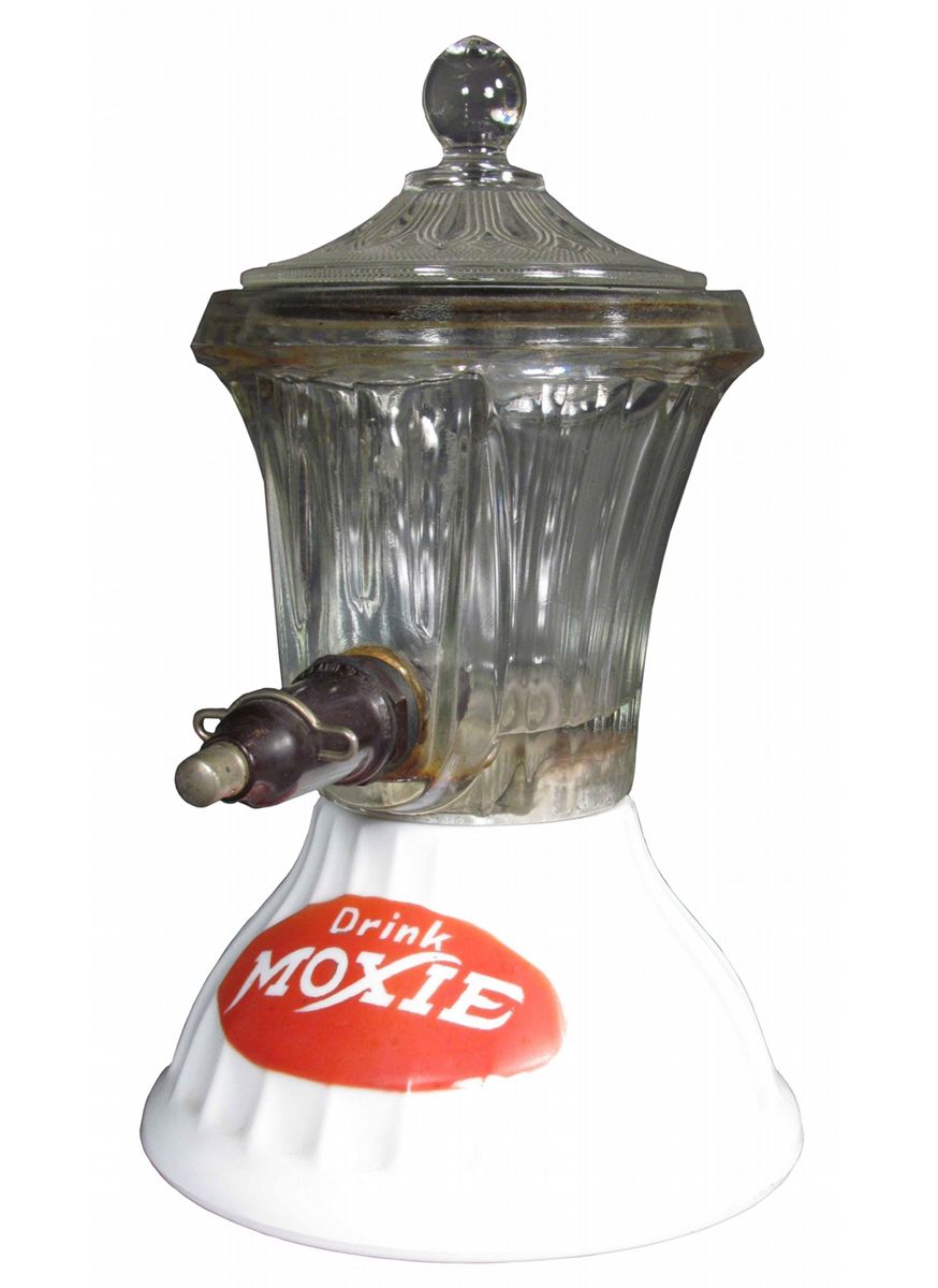 Moxie Milk & Pressed Glass Syrup Dispenser. Very good original condition.10 inches tall.
