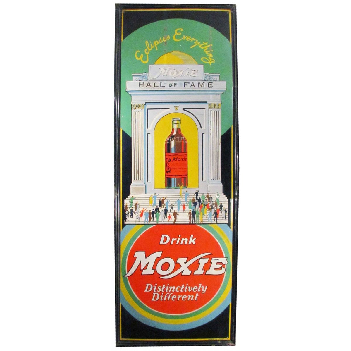 Moxie self Framed Embossed Tin sign. Moxie hall of fame. Some paint loss and discoloration on top quarter, normal crazing and a few scratches, otherwise good condition. 18 1/4 X 53 1/2 inches.