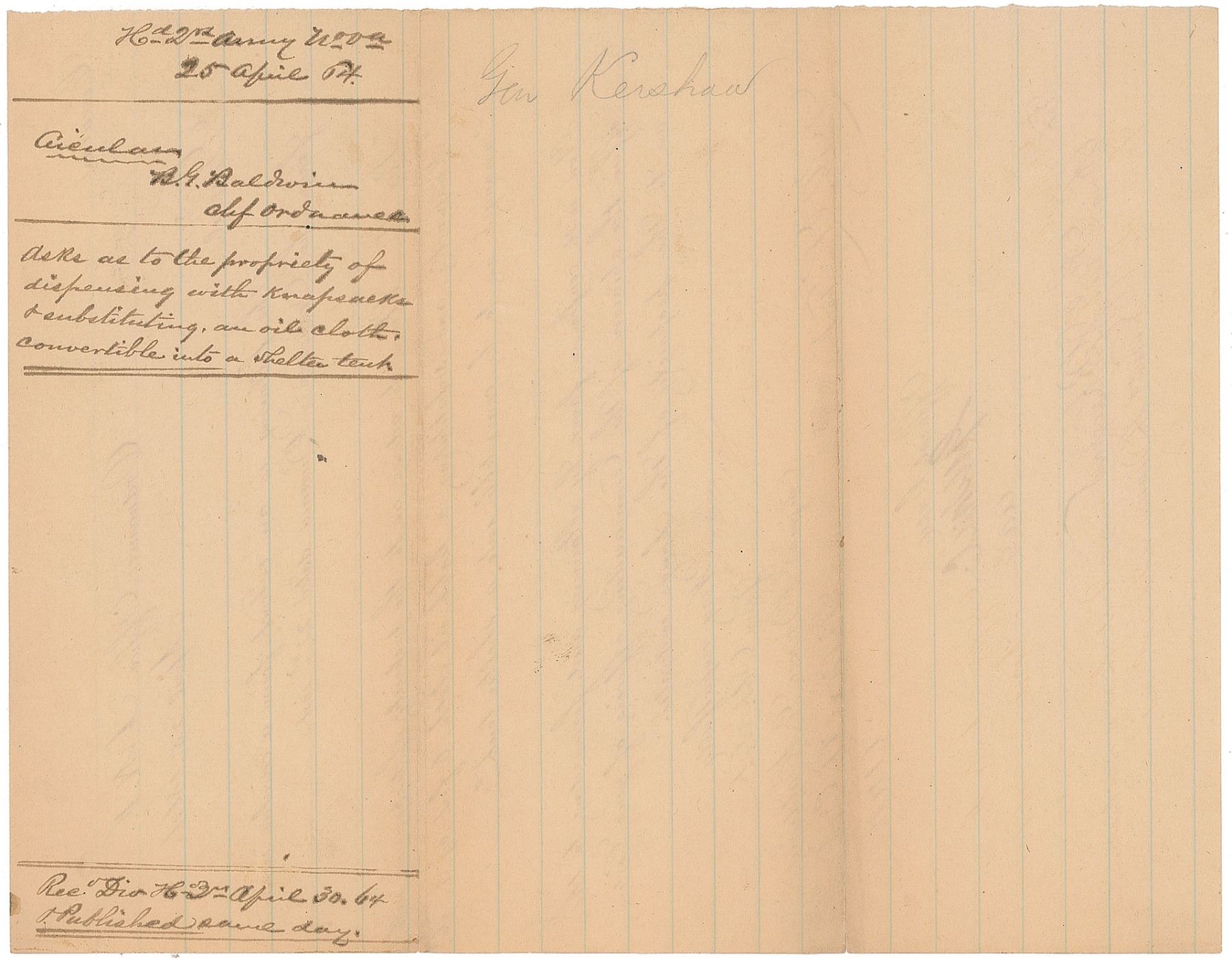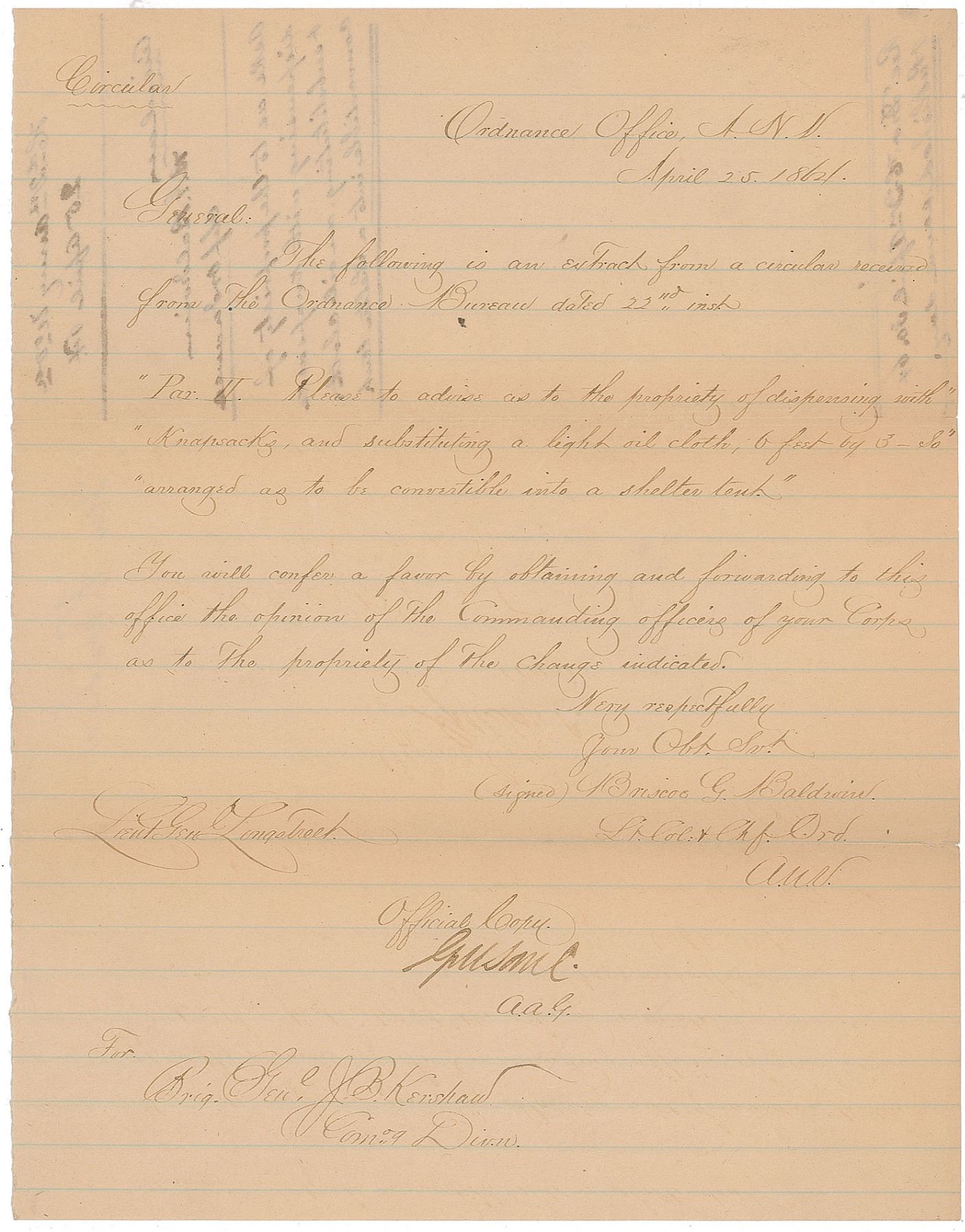 Staff officer and brigadier general (1838–1901) in the Provisional Army of the Confederate States. Manuscript DS, signed “G. M. Sorrel,” one page, 7 x 9, April 25, 1861. Official letter issued by Lt. Col. Briscoe G. Baldwin to Brig. Gen. J. B. Kershaw, in full: "The following is an extract from a circular received from the Ordnance Bureau dated 22nd inst., 'Par II. Please to advise as to the propriety of dispensing with Knapsacks and substituting a light oil cloth, 6 feet by 3. So arranged as to be convertible into a shelter tent.' You will confer a favor by obtaining and forwarding to this office the opinion of The Commanding officers of your Corps as to the propriety of the change indicated." Signed and approved at the conclusion by Sorrel. In fine condition.