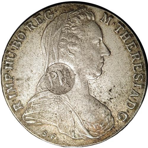 <B>Portuguese Colonial. PM Counterstamp (1889), </B></I>KM58, Davenport 482, large PM countermark in an indented circle, host coin is an Austrian Taler of Maria Theresa 1780-SF, restrike. Both the counterstamp and the host coin are choice toned XF. Very scarce type and grade.<BR><BR><b>Shipping:</b> Coins & Currency (<a target="_blank" href="http://www.heritageauctions.com/common/shipping.php">view shipping information</a>)