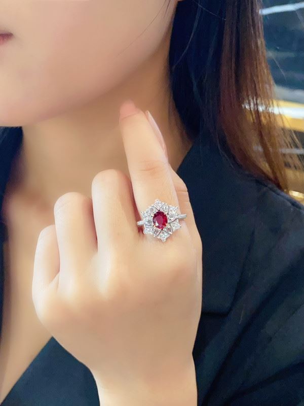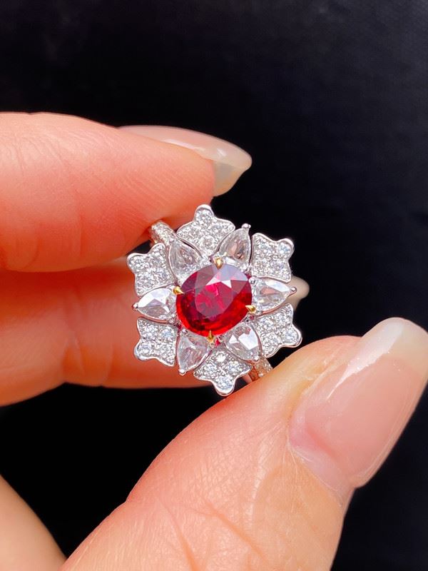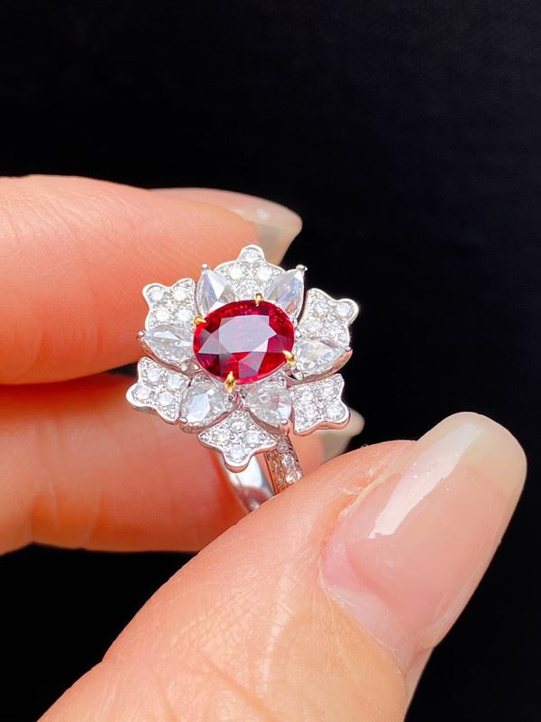 An oval Mozambique ruby takes center stage, framed by pear- and round-cut colorless accent stones in a floral halo, set on a white-toned band for a radiant yet refined look.Ring size: 6, circumference: 52 mm, diameter: 16.6 mm, main diamond: 1.06 ct, side diamonds: 0.723 ct.Note: Comes with a GRS report.