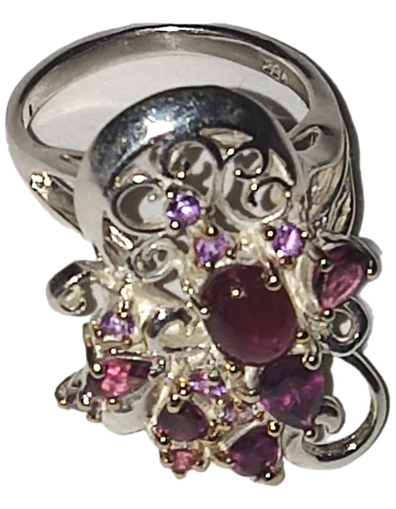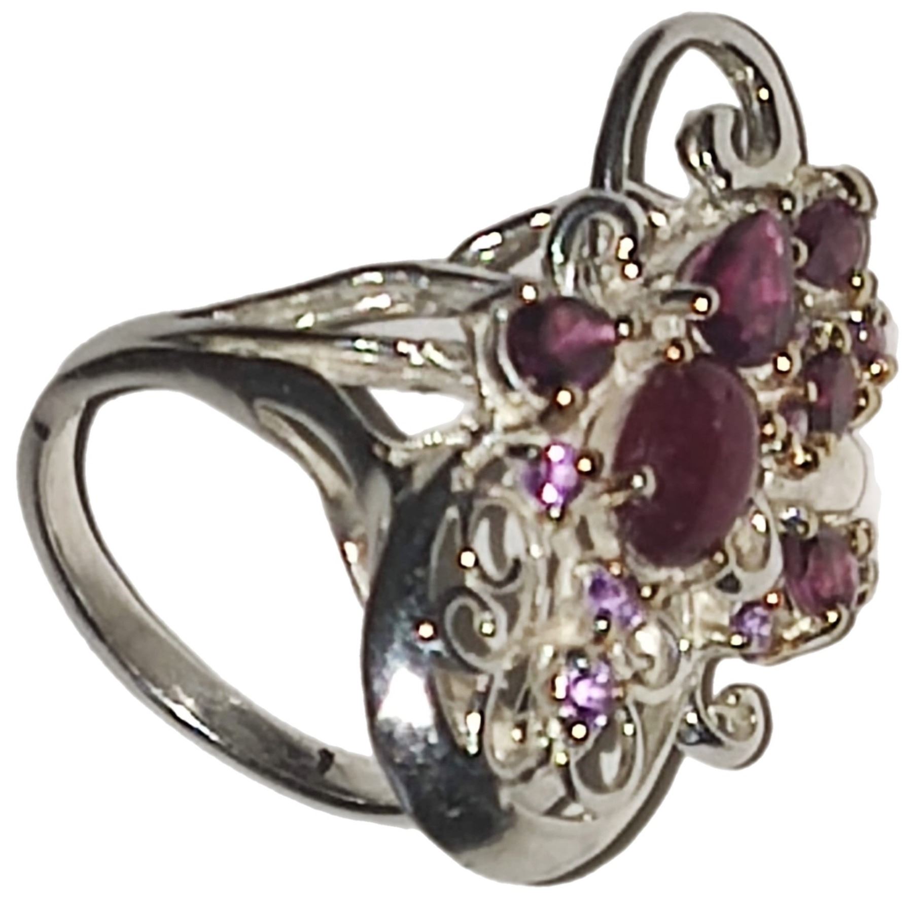 Mozambique Ruby sterling silver ring set amongst rhodolite and amethyst gemstones. Size 6.75 (US), Size O (UK). Gemstone 7x5mm. 55mm Circumference. 17.35mm Diameter. 7.9 grams. 925 stamped.