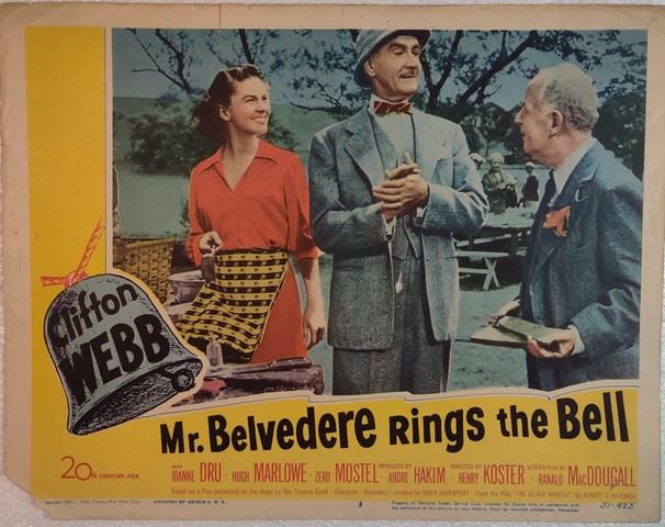 Mr. Belvedere Rings the Bell (20th Century Fox, 1951) lobby card. Comedy. Starring Clifton Webb, Joanne Dru, Hugh Marlowe, Zero Mostel, William H. Lynn, Doro Merande. Directed by Henry Coster. Edge wear, creases, tears, pin-holes, paper loss. Fair. (11"x14").