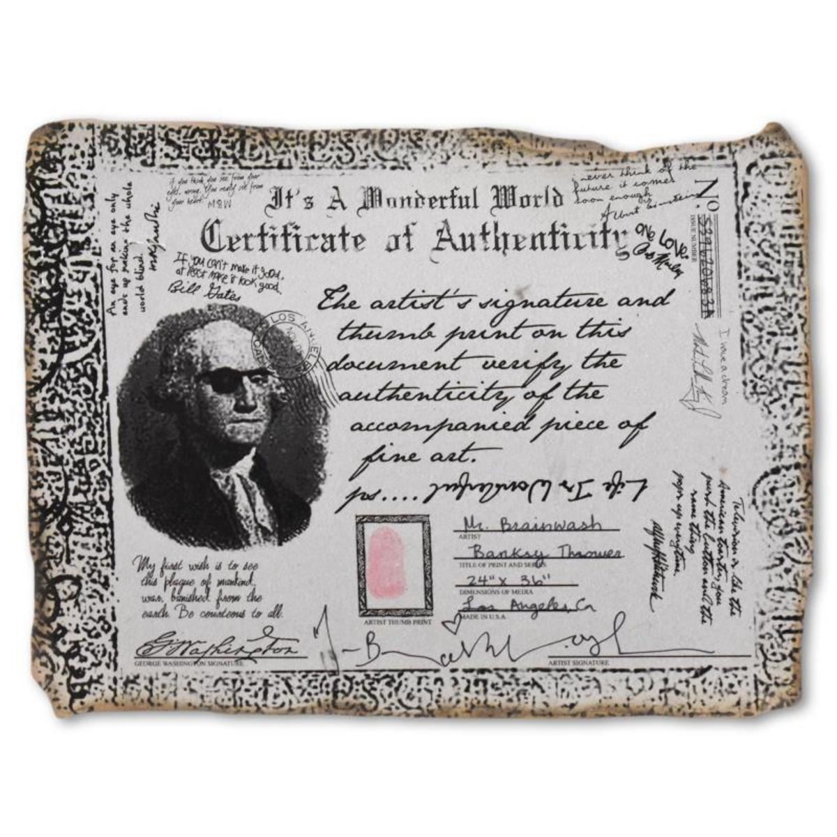 "Banksy Thrower" is a original mixed media on deckle edge paper by Mr. Brainwash, hand signed by the artist. This piece is also hand signed inverso and bears the thumbprint of the artist. Includes Certificate of Authenticity. Measures approximately 24" x 36" (image).
