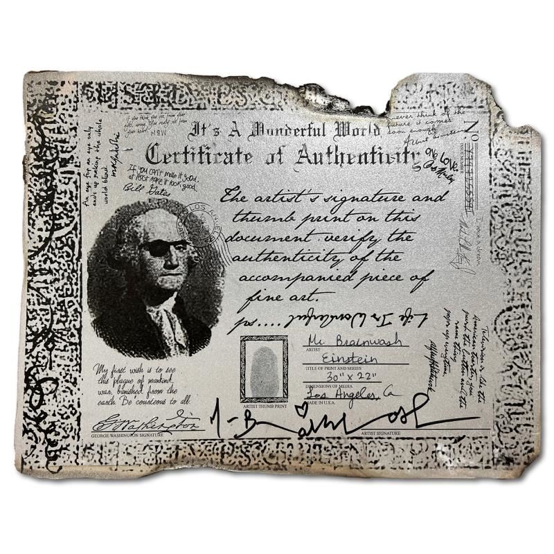"Einstein" is a mixed media original on deckle edge paper by Mr. Brainwash, hand signed inverso and bearing the thumbprint of the artist. This piece comes custom framed. Includes Certificate of Authenticity. Measures approx. 26" x 34" (frame), 22" x 30" (image).