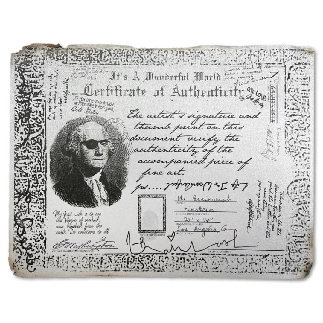 "Einstein" is a mixed media original on deckle edge paper by Mr. Brainwash, hand signed inverso and bearing the thumbprint of the artist. This piece comes custom framed. Includes Certificate of Authenticity. Measures approx. 20" x 24" (frame), 16" x 20" (image).