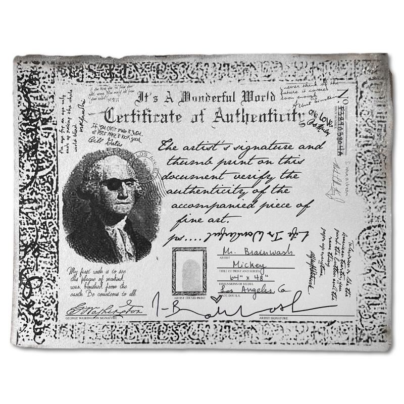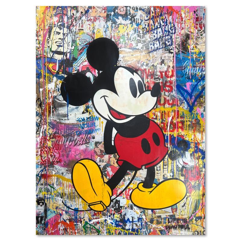 "Mickey" is a mixed media original on deckle edge paper by Mr. Brainwash, hand signed inverso and bearing the thumbprint of the artist. Includes Certificate of Authenticity. Measures approx. 48" x 64" (image).