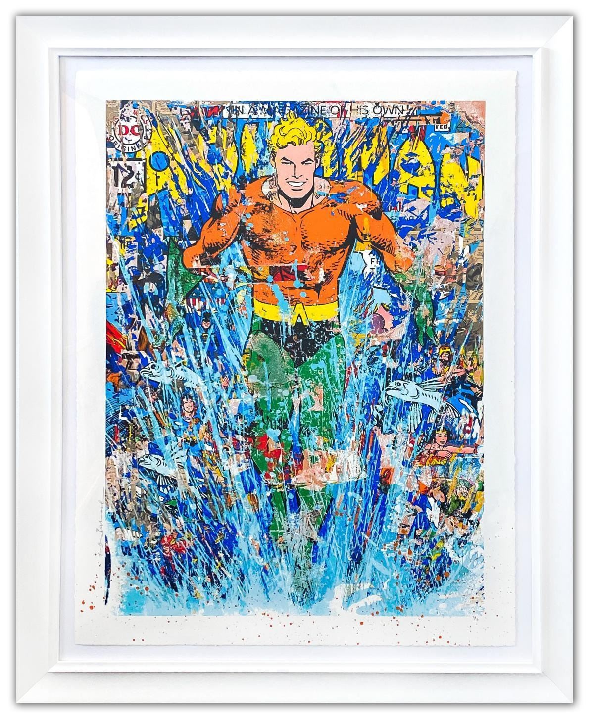 Artist: Mr. Brainwash. Medium: Mixed Media Hand Finished Silkscreen Serigraph. Title: Aquaman. Size (Unframed): 48" x 37". Size (Framed): 58" x 36". Limited Edition: Hand Signed and Numbered 4/15. Certificate of Authenticity: Is included. Additional: Custom framed. Reference# 15081.