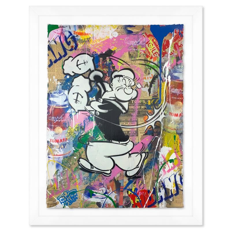"Popeye" is a mixed media original on deckle edge paper by Mr. Brainwash, hand signed by the artist. This piece comes custom framed. Includes Certificate of Authenticity. Measures approx. 34" x 26" (frame), 22" x 30" (image).