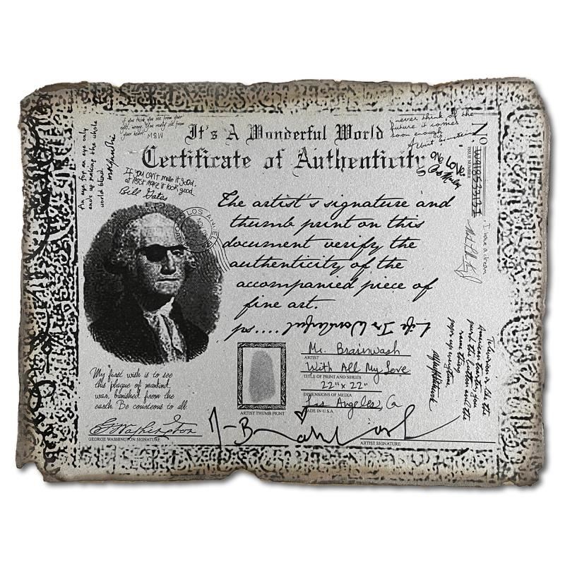 "With All My Love" is a mixed media original on deckle edge paper by Mr. Brainwash, hand signed inverso and bearing the thumbprint of the artist. This piece comes custom framed. Includes Certificate of Authenticity. Measures approx. 26" x 26" (frame), 22" x 22" (image)