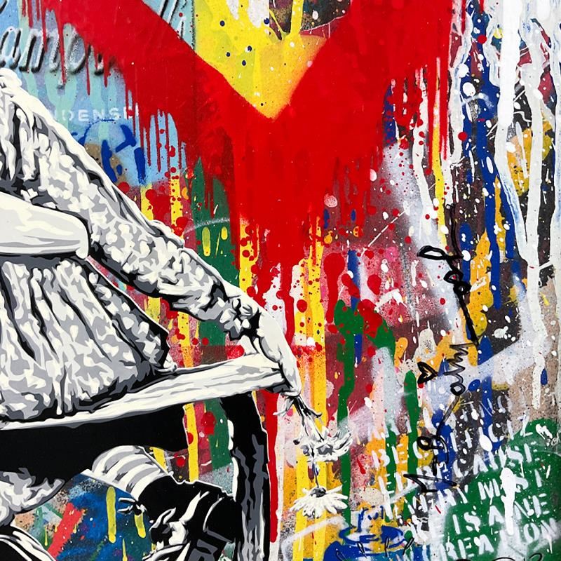 "Work Well Together" is a mixed media original on wood panel by Mr. Brainwash, hand signed by the artist. This piece bears the thumbprint of the artist and comes with a splashed frame. Includes Certificate of Authenticity. Measures approx. 29.5" x 33.5" (frame), 19" x 23" (image).