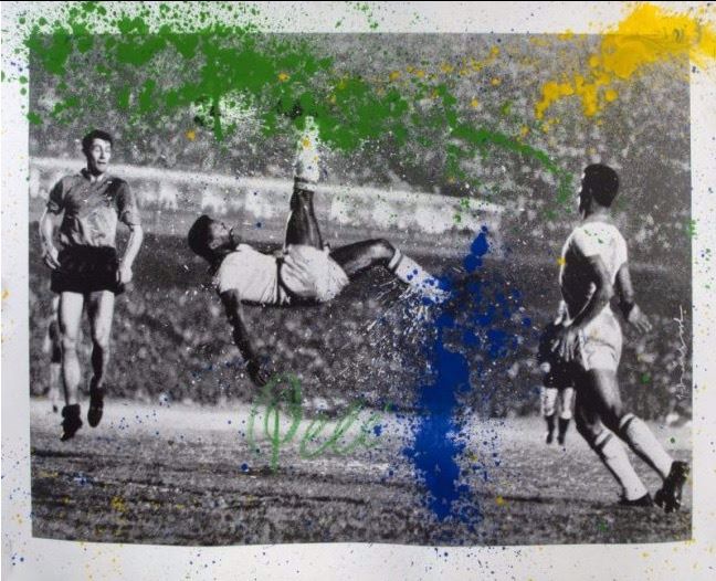 Pele: Bicycle Kick, 2016 Screenprint on paper hand embellished with PAINT 36 1/4 × 47 3/4 in 92.1 × 121.3 cmSigned and Numbered and Finger Printed by both MR BRAINWASH AND PELEThis is an amazing item, Its large and very impressive!!!!PSA COA ALSO. This item comes with a Certificate of Authenticity from a third party authenticator. This Certification of Authenticity does not imply that the item will be certified by any other rival authentication companies. The accompanied certification is the only certification the auction company can confirm. These items are being sold as collectable pieces and there is no guarantee that this item can be resold on any online marketplace. Each of these companies has their own policies and politics.