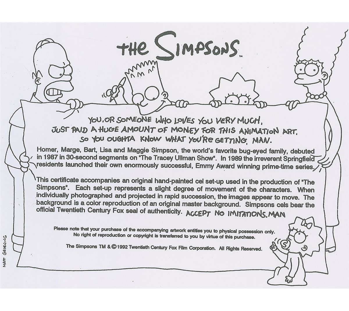 (20th Century Fox, 1991) Original production cel featuring Mr. Burns from The Simpsons episode ‘Bart Gets Hit by a Car.’ The cel is placed on a matching studio copy background. Image measures 6 x 7, with overall dimensions of 13 x 11. 20th Century Fox COA included. In fine condition, with a bit of trivial chipping to paint.