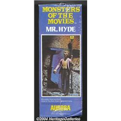 <B>Mr. Hyde Model Kit (Aurora, 1975).</B></I> This snap-together model was part of Aurora's "Monsters of the Movies" series. That best-dressed of all monsters, Mr. Hyde, comes with his very own street lamp (perfect for hanging out by while looking menacing) on a base of "cobblestone street." Hyde has a glow-in-the-dark, movable head as well as movable arms. The kit is in Mint condition, still in its original shrink-wrapped box. <BR><BR><B>Important notice:</B> Heritage usually auctions material at the rate of 200-250 lots per hour. On some occasions eBay Live bid software or the Internet may not be able to keep up with the pace of the auction. We recommend placing a realistic absentee bid now as insurance to avoid disappointment. Occasionally the auctioneer may eliminate or reject an eBay Live bid, and the auctioneer may also reopen a lot after the close of the eBay live bidding (usually because we missed an audience bid), and may reject your bid even if it shows you as the winning bidder. By bidding via eBay Live, you agree that Heritage may award the lot to another bidder at its sole discretion under the circumstances described above or any other reasonable circumstances. Since eBay bids are not shown to us until we open the lot on the floor, we treat those bids just like floor bids. In most cases the floor responds before the eBay bid is presented to us, due to Internet lag time, so for consistency we have made it a policy that floor bids are always considered first over tie eBay live bids. Also please note that all Heritage lots purchased through eBay Live carry a 20% Buyer's Premium. Please make sure you read the Terms and Conditions before you bid.