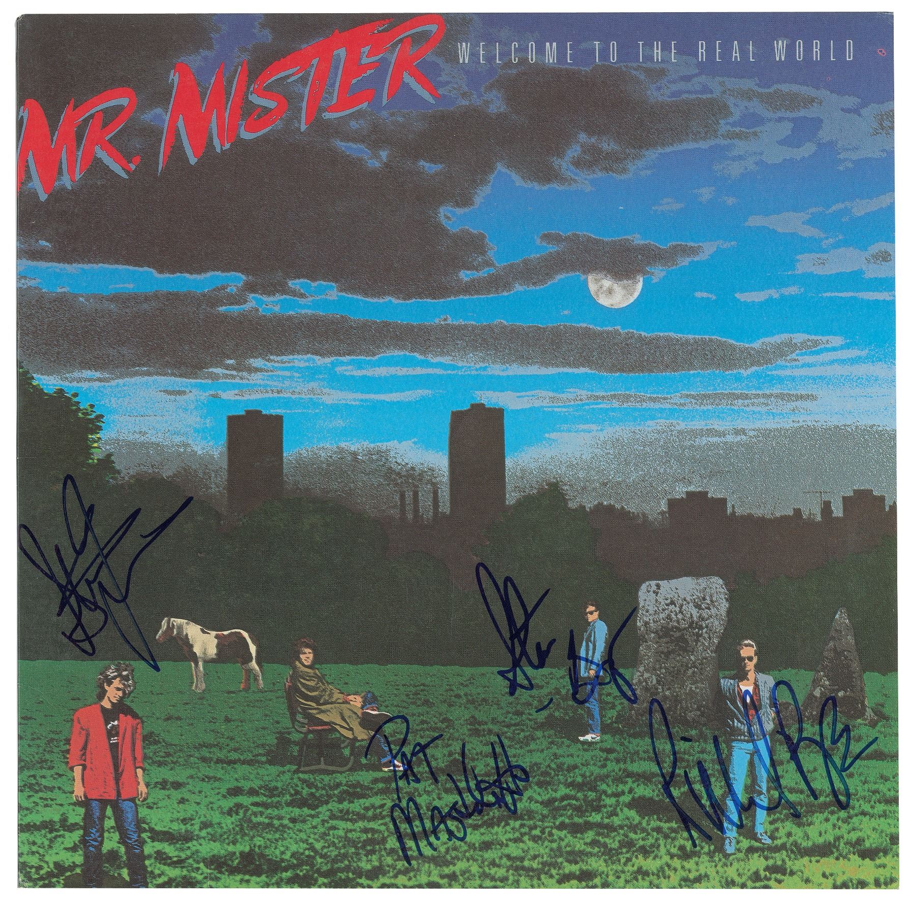 Welcome to the Real World promotional album by Mr. Mister, signed on the front cover in blue felt tip by Richard Page, Steve George, Pat Mastelotto, and Steve Farris. In fine to very fine condition. The record is included.
