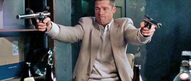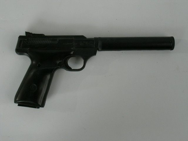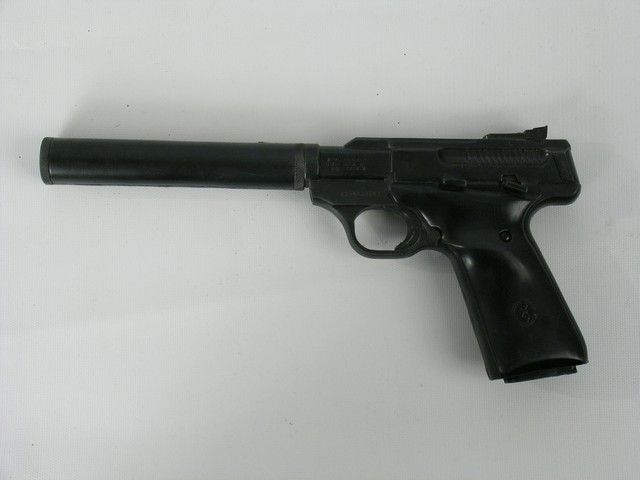 A poker game goes very wrong in the action-comedy, "Mr. & Mrs. Smith" (2005), starring Brad Pitt and Angelina Jolie. In this non-stop shoot-fest, John Smith (Pitt), draws two Browning Buckmark Camper pistols with suppressor during the game. This is one of the screen used stunt versions of the guns. Extra light weight, and made of special rubber. Approx 11.5" x 5.5"
