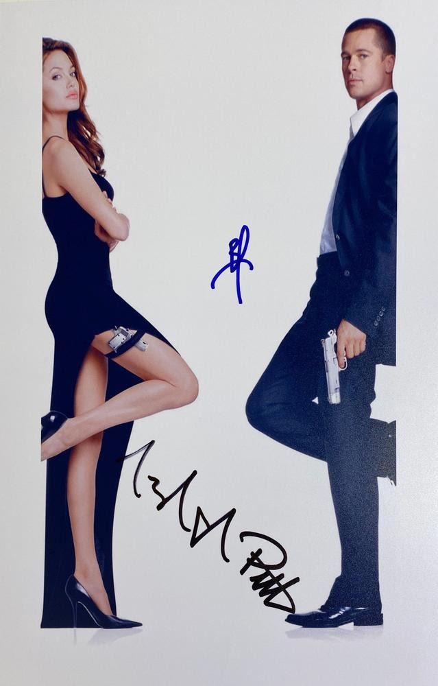 Mr. & Mrs. Smith facsimile signed movie photo autographed by Brad Pitt and Angelina Jolie. 8x10 inches. This item is a reprint of an original autograph