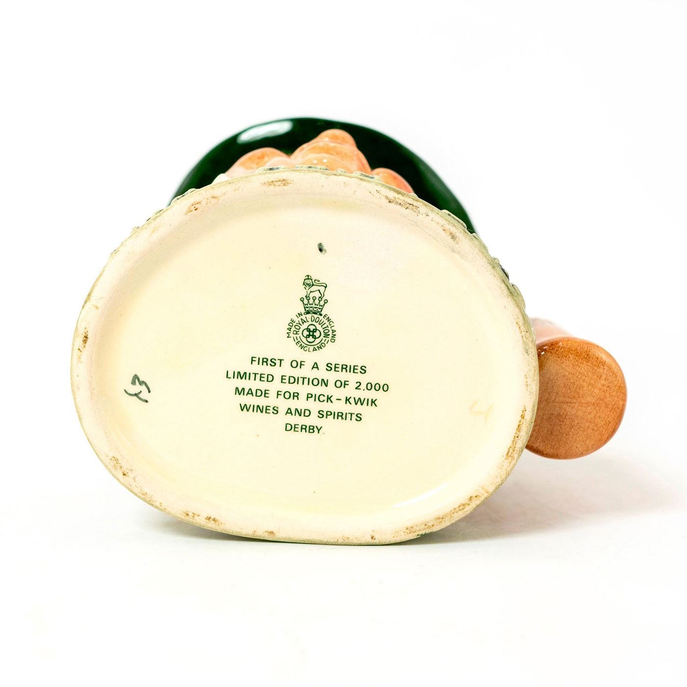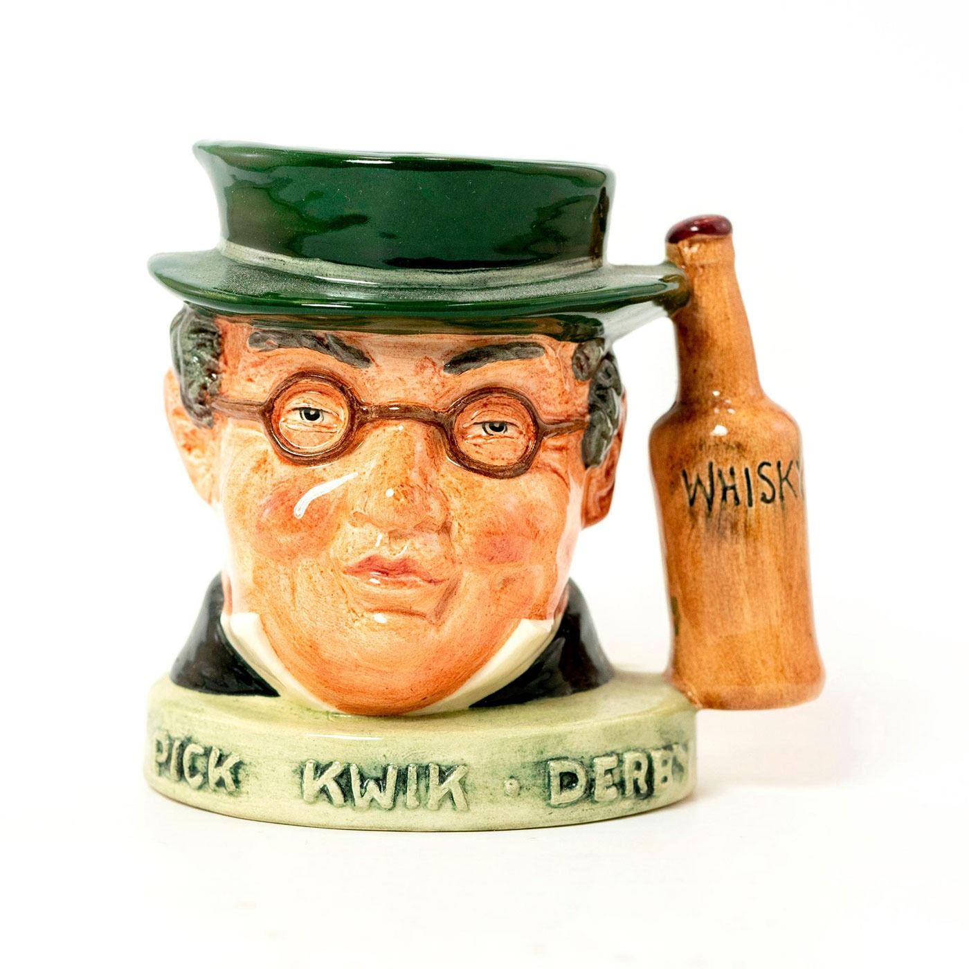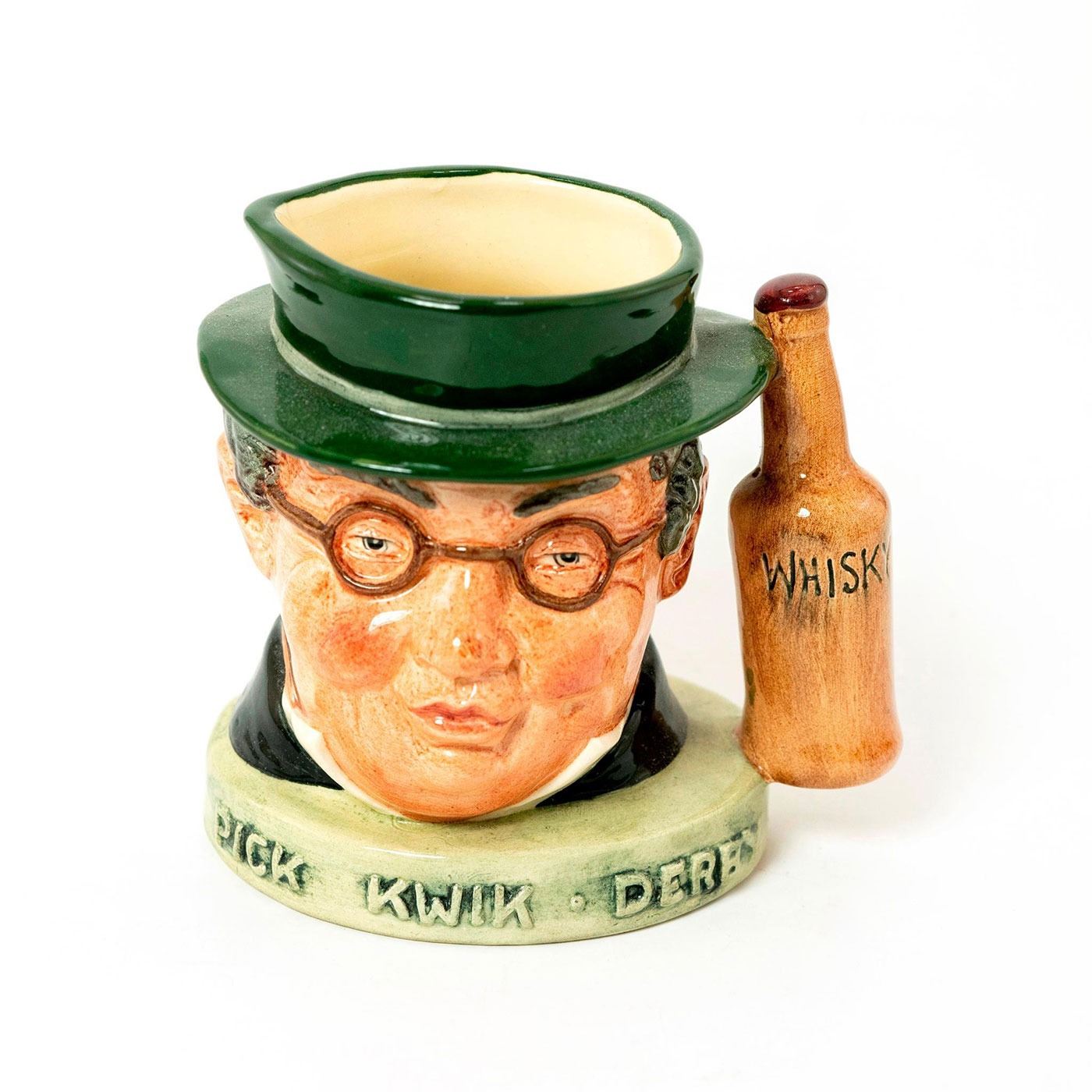 Glazed; Etched with Pick, Kwick, Derby. Whisky bottle handle. Royal Doulton backstamp.