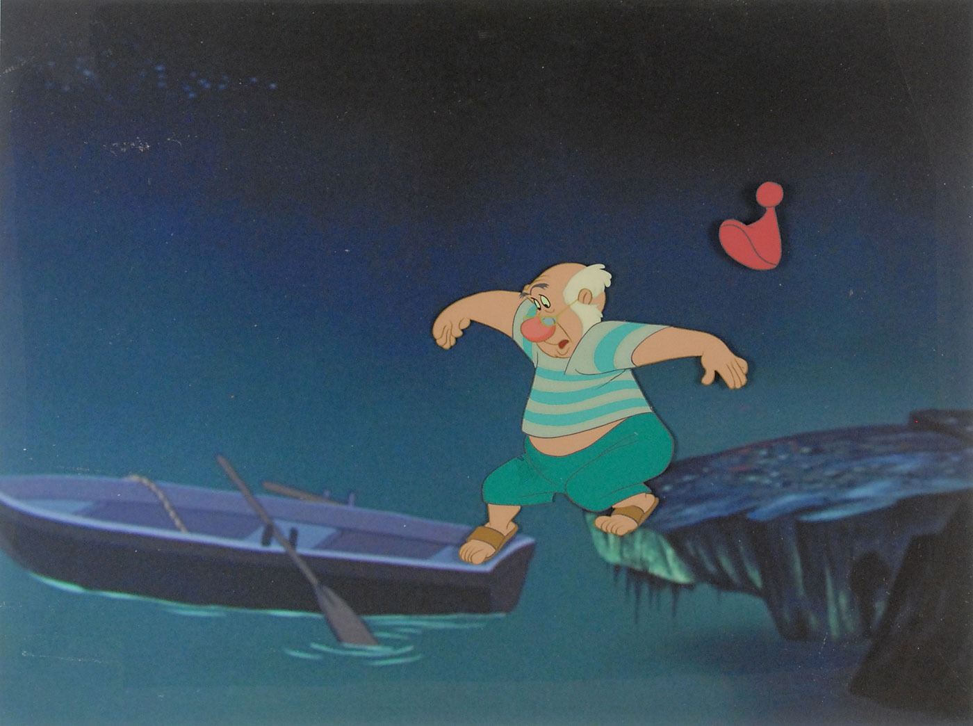 (Walt Disney Studios, 1953) Original production cel featuring Mr. Smee from Peter Pan, showing him cautiously sticking out his foot towards a rowboat. The cel is placed on a matching studio copy background. Image measures 5 x 5, with overall dimensions of 15 x 12. In fine condition.