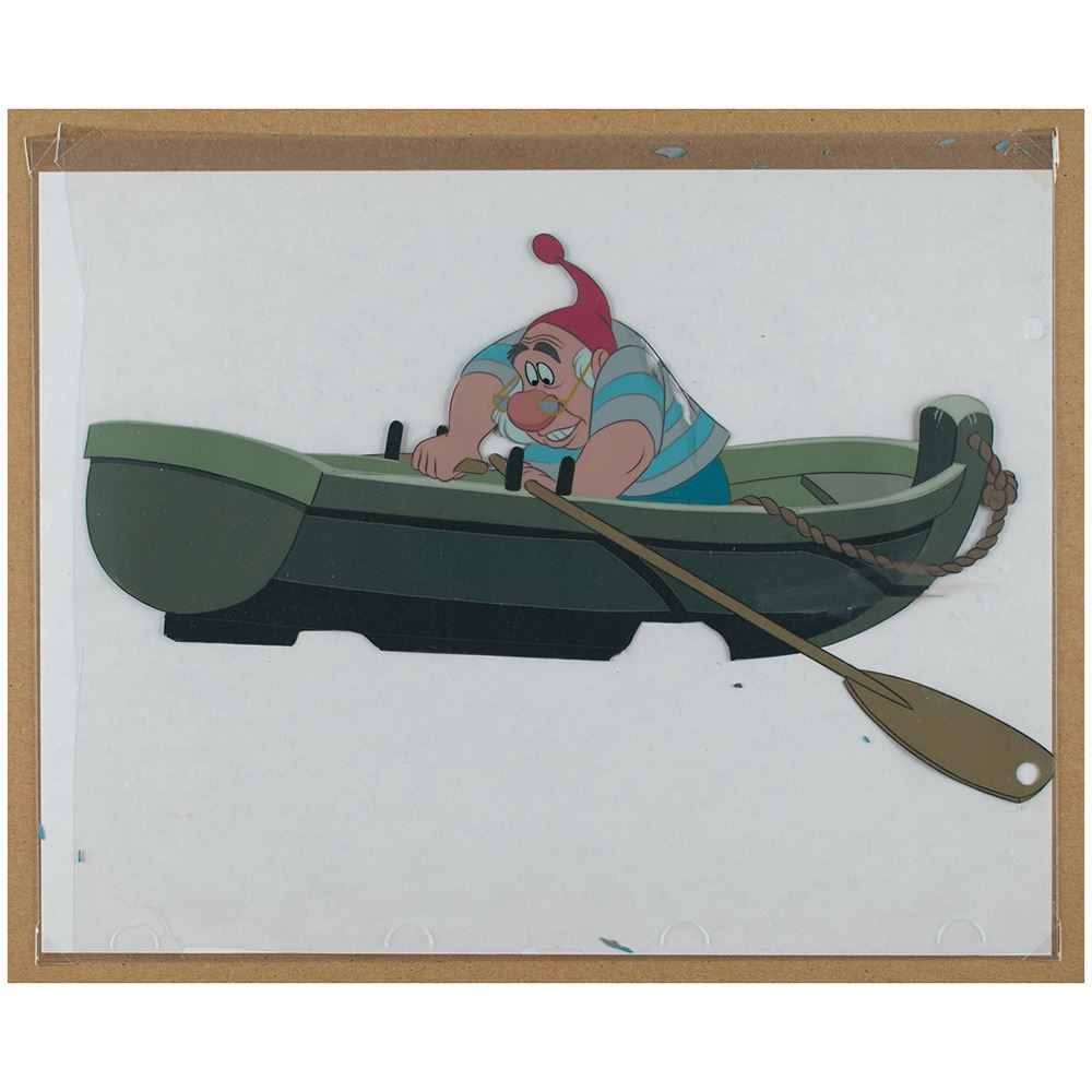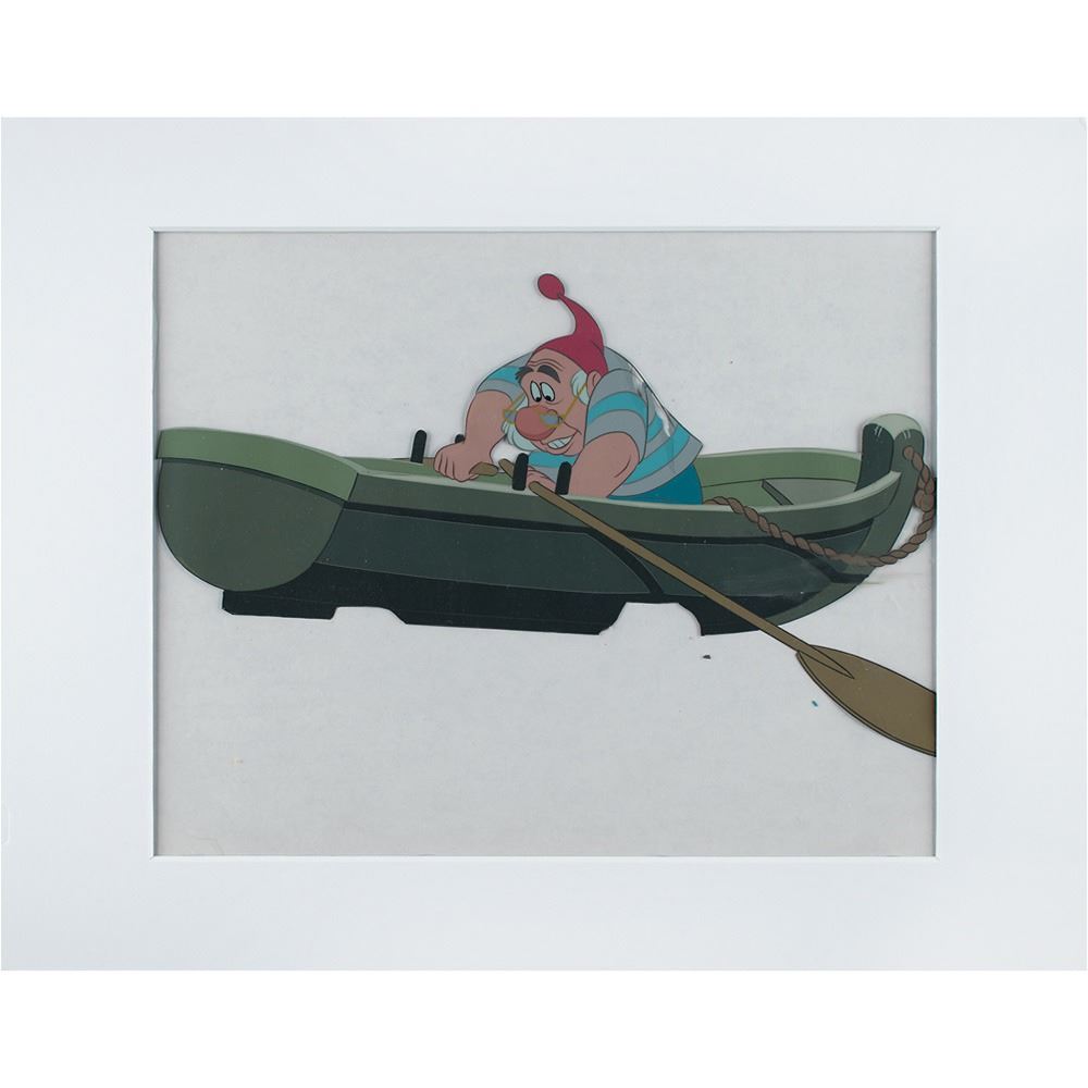 (Walt Disney Studios, 1953) Original production cel featuring Mr. Smee from Peter Pan, showing Captain Hook's sidekick in his rowboat. Image measures 10 x 6.25, with a mat opening of 10 x 8. Matted to an overall size of 14 x 11. In fine condition.