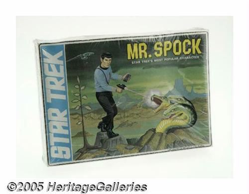 <B>Mr. Spock Model Kit (AMT Corporation, 1968).</B></I> The first officer of Star Trek's starship Enterprise is presented here in this plastic model kit produced by AMT Corporation. The box is still sealed in its original plastic, but has some blunted edges, a couple of warped areas at the left and right edges, and a crease in the box at the right and upper edges. The assembled model stands over six inches tall and features the popular, pointed-eared Spock in a life-and-death confrontation with a giant space serpent. <I>From the collection of Chris Bell.</B></I>