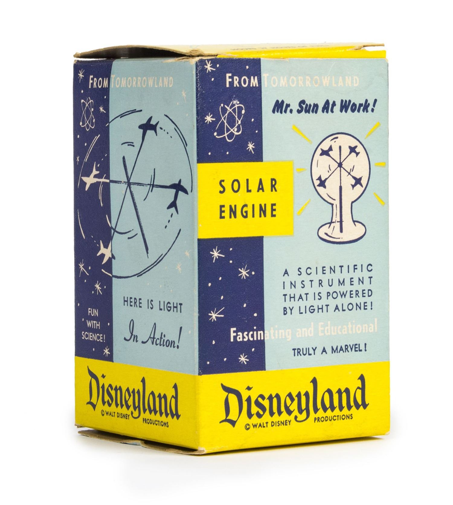 (Disneyland, 1956) A beautiful and delicate solar engine toy from the early days of the park in its original box. This toy is powered by sunlight, which makes the depictions of airplanes spin around. The toy measures 5" tall and 3" in diameter in the 5.25"x3.25" and 3.25" deep box. The condition of the toy is good, with some discoloration to the base from glue residue. The box has some edge-wear and spots of tearing on the flaps, and the lid has separated from the box but is included. The paper base of the toy has been reattached to the glass.