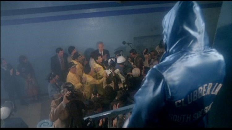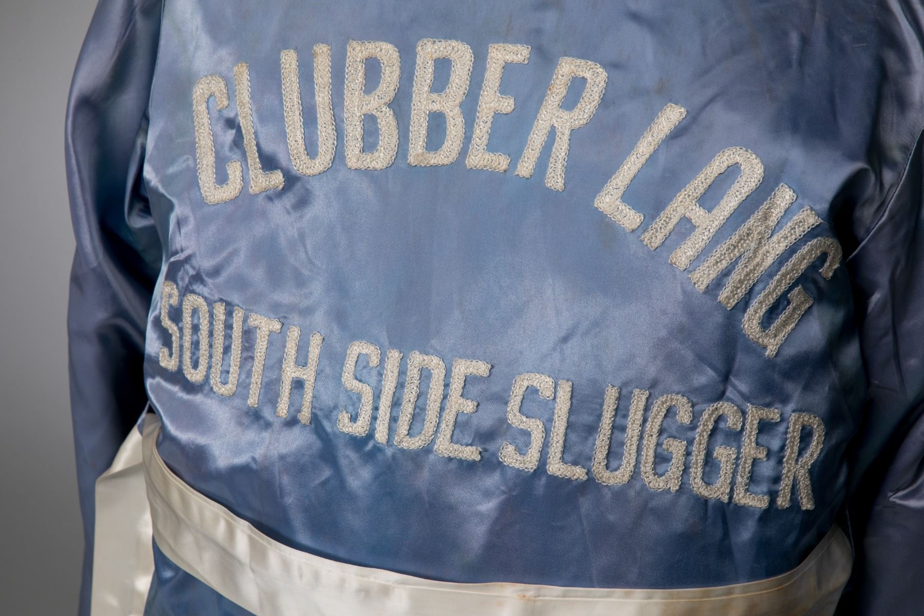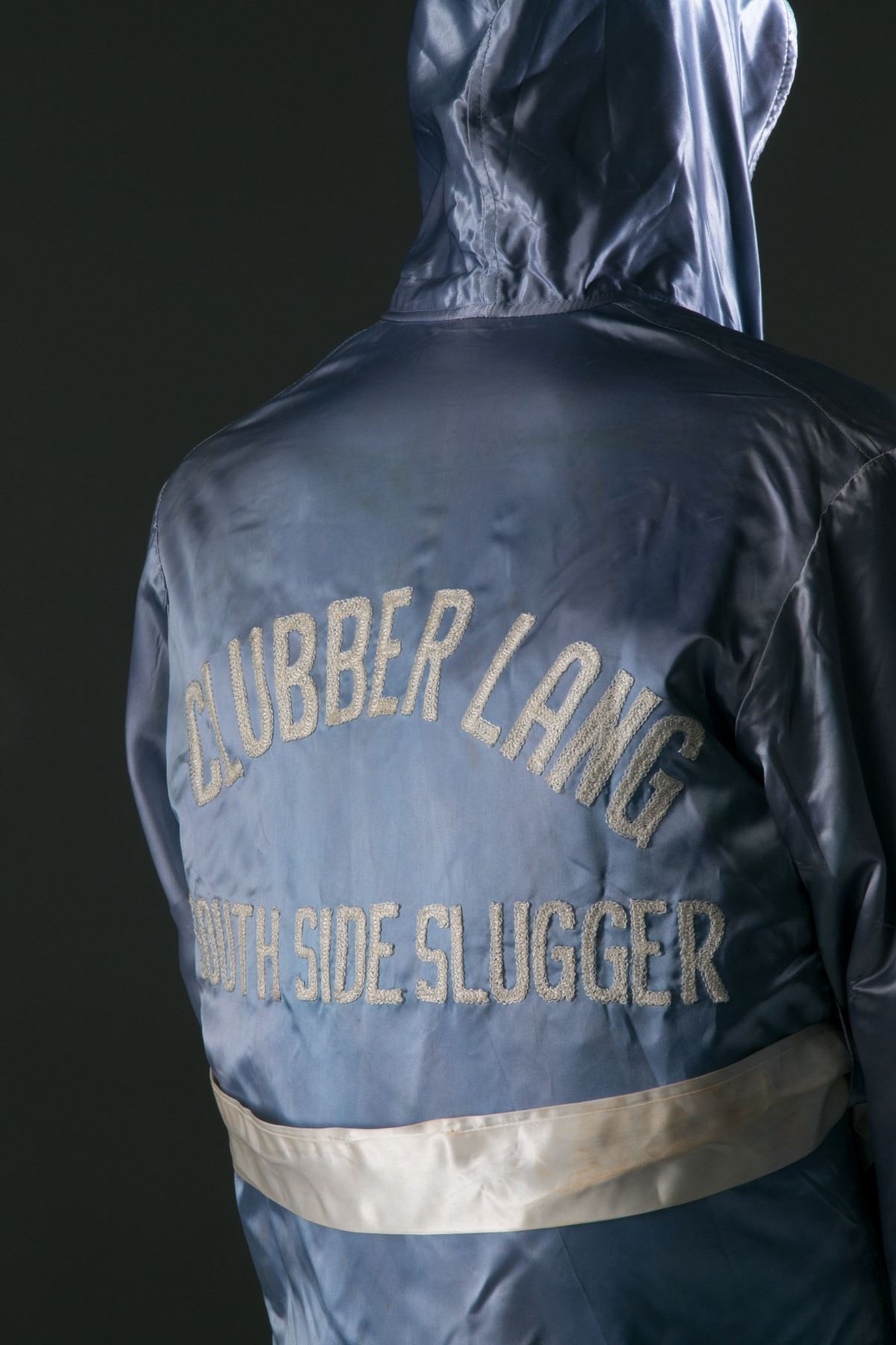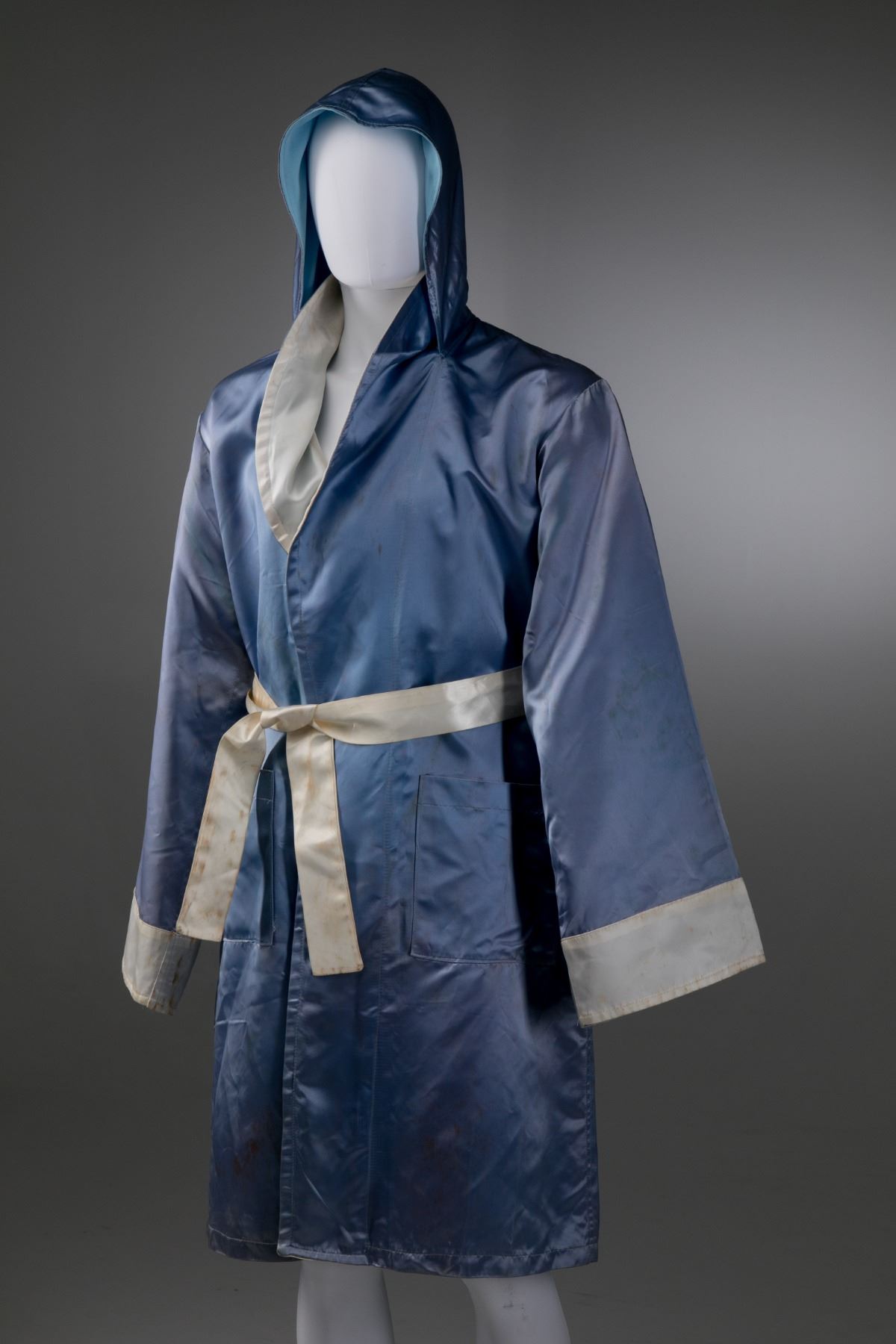 Mr. T’s blue boxing robe from his first fight with Rocky Balboa (Sylvester Stallone) in “Rocky III”. Consisting of a powder blue satin dressing robe with oversize sleeves, integral hood, ivory colored shawl lapel and cuffs, two hip pockets, and an ivory satin sash tie threaded through hoops at the hip. The hood and interior of the robe lined in baby blue synthetic stretch fabric. The back features embroidered white thread lettering above the waist reading, "Clubber Lang South Side Slugger". All stitching in baby blue thread. Exhibiting light production wear and uniform faint streak staining from age over all satin surfaces, most evident on the edge of the left ivory lapel and right ivory sleeve cuff. Highly visible worn in the lead up to Lang's first bout with "Rocky" (Sylvester Stallone) in which he handily pummels the champ to take the world title. Comes with a Certificate of Authenticity from Studio Auctions.