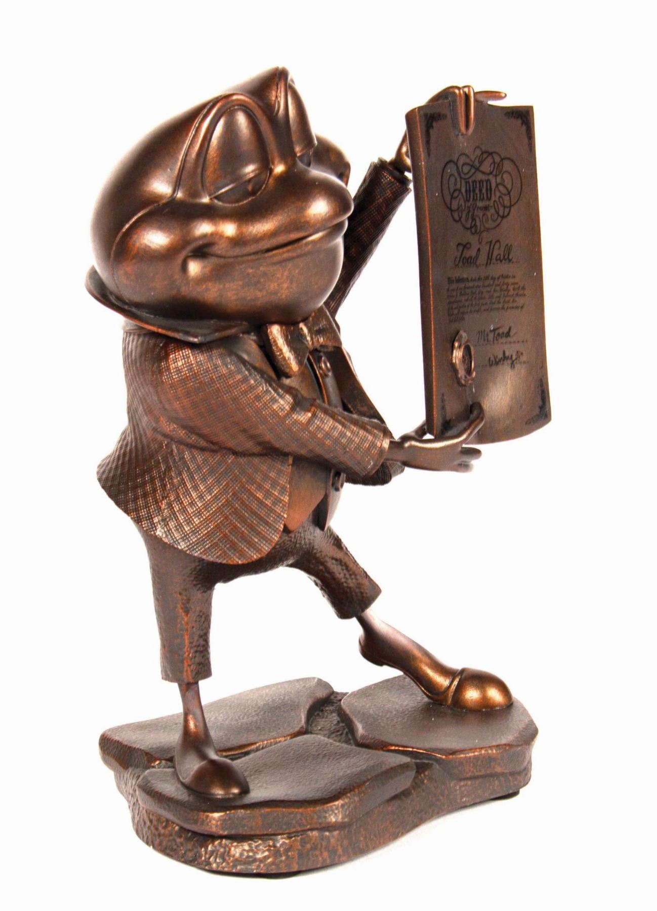 (Disneyland, 2019) A limited edition figure of Mr. Toad by artist Derek Lesinski. The figure is composed of resin in a bronze-like finish and was created in celebration of the 70th anniversary of The Adventures of Ichabod and Mr. Toad. Limited to only 50 pieces, the figure measures approximately 10.5" tall and is in fine unused condition within its original packaging.